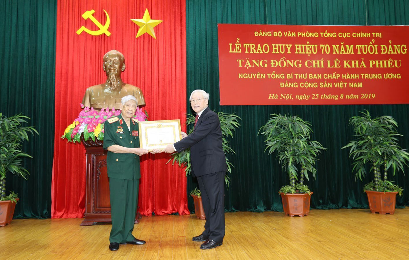 Thực hiện Quyết định của Thường vụ Quân ủy Trung ương về việc tặng Huy hiệu Đảng đợt 2-9-2019, sáng 25-8-2019, tại Hà Nội, Đảng bộ Văn phòng Tổng cục Chính trị Quân đội nhân dân Việt Nam tổ chức Lễ trao Huy hiệu 70 năm tuổi Đảng tặng đồng chí Lê Khả Phiêu, nguyên Tổng Bí thư Ban Chấp hành Trung ương Đảng, nguyên Chủ nhiệm Tổng cục Chính trị Quân đội nhân dân Việt Nam.
