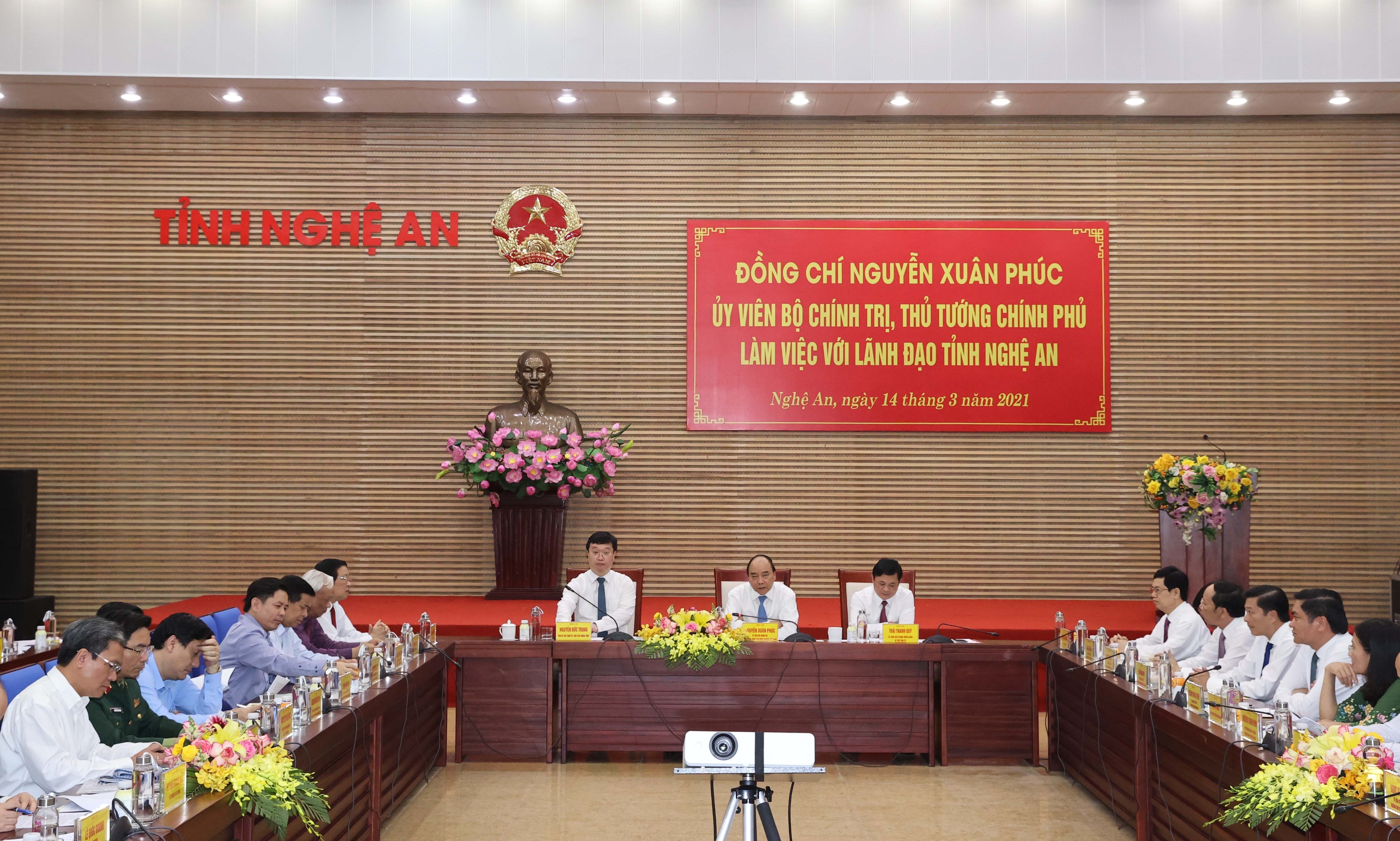TCCS - Sáng 14-3-2021, Ủy viên Bộ Chính trị, Thủ tướng Chính phủ Nguyễn Xuân Phúc và đoàn công tác của Chính phủ đã có buổi làm việc với lãnh đạo chủ chốt tỉnh Nghệ An - địa phương là trung tâm của khu vực Bắc Trung Bộ và đang nỗ lực phấn đấu trở thành tỉnh khá của cả nước.