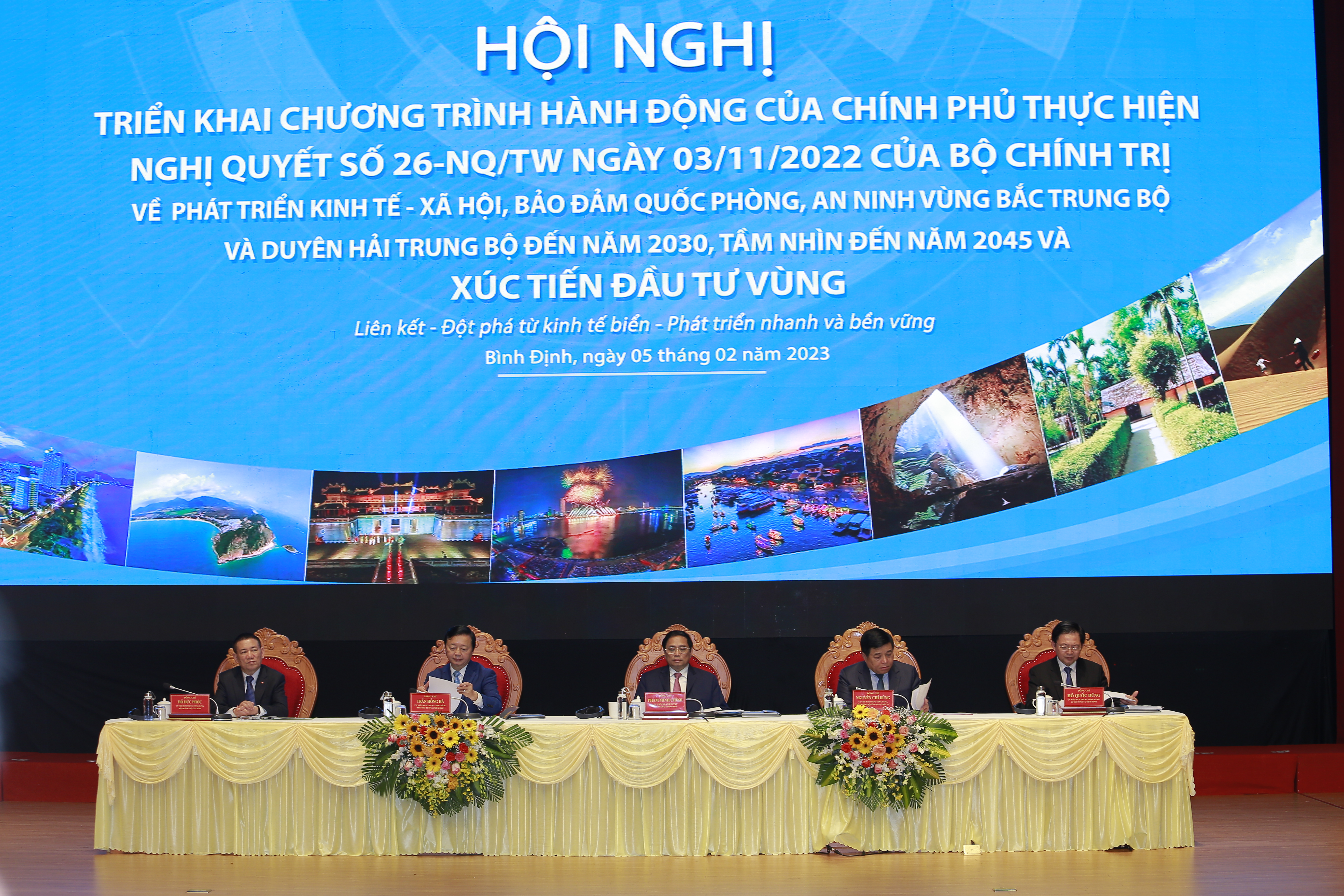TCCS - Ngày 5-2-2023, tại tỉnh Bình Định, Ủy viên Bộ Chính trị, Thủ tướng Chính phủ Phạm Minh Chính chủ trì Hội nghị triển khai Chương trình hành động thực hiện Nghị quyết số 26-NQ/TW, ngày 3-11-2022, của Bộ Chính trị, “Về phát triển kinh tế - xã hội và bảo đảm quốc phòng, an ninh vùng Bắc Trung Bộ và duyên hải Trung Bộ đến năm 2030, tầm nhìn đến năm 2045” và xúc tiến đầu tư vùng với chủ đề “Liên kết - Đột phá từ kinh tế biển - Phát triển nhanh và bền vững”.