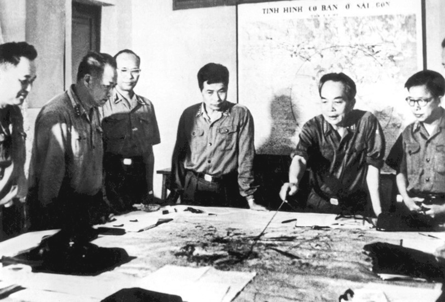 Ngày 14-4-1975, Bộ Chính trị quyết định đặt tên cho Chiến dịch giải phóng Sài Gòn - Gia Định là Chiến dịch Hồ Chí Minh với phương châm “Thần tốc, táo bạo, bất ngờ, chắc thắng” (Trong ảnh: Đại tướng Võ Nguyên Giáp cùng các đồng chí trong Quân ủy Trung ương duyệt phương án tác chiến Chiến dịch Hồ Chí Minh, tại Hà Nội, tháng 4-1975) _Ảnh: TTXVN