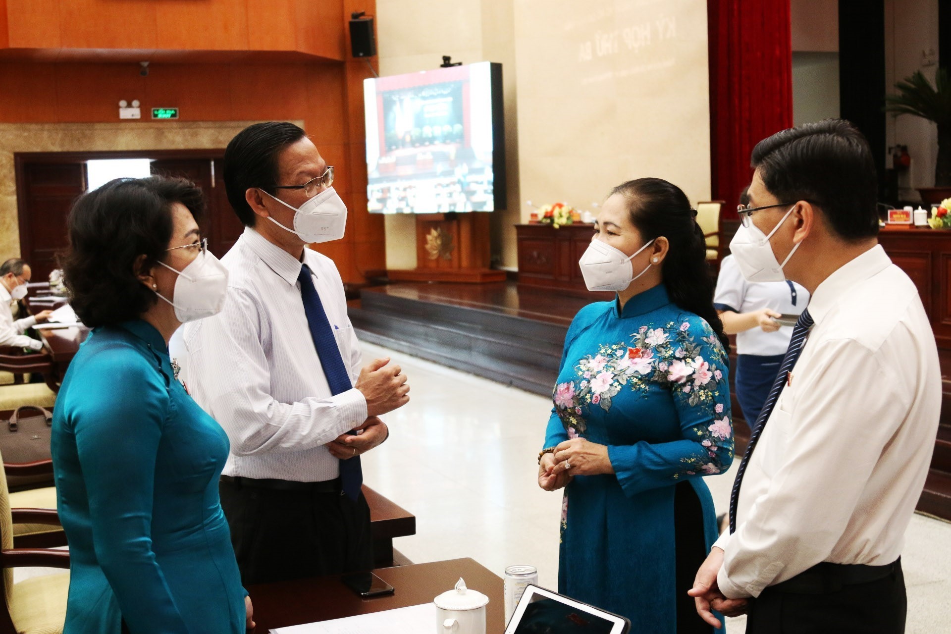 Lãnh đạo Hội đồng nhân dân, Ủy ban nhân dân, Ủy ban Mặt trận Tổ quốc Việt Nam Thành phố Hồ Chí Minh trao đổi tại Kỳ họp thứ 3 Hội đồng nhân dân Thành phố Hồ Chí Minh, nhiệm kỳ 2021 - 2026 _Ảnh: Tư liệu