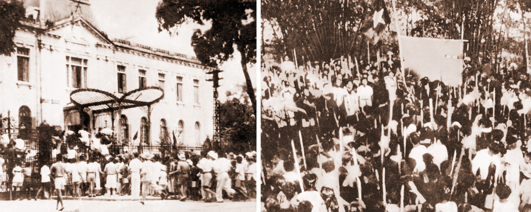 Hưởng ứng lời kêu gọi của Chủ tịch Hồ Chí Minh và Mặt trận Việt Minh, nhân dân cả nước vùng dậy cướp chính quyền, làm Cách mạng Tháng Tám thành công (Trong ảnh: Những ngày Tháng Tám sôi sục ở Hà Nội (ảnh trái) và ở Sài Gòn (ảnh phải)) _Nguồn: hochiminh.vn