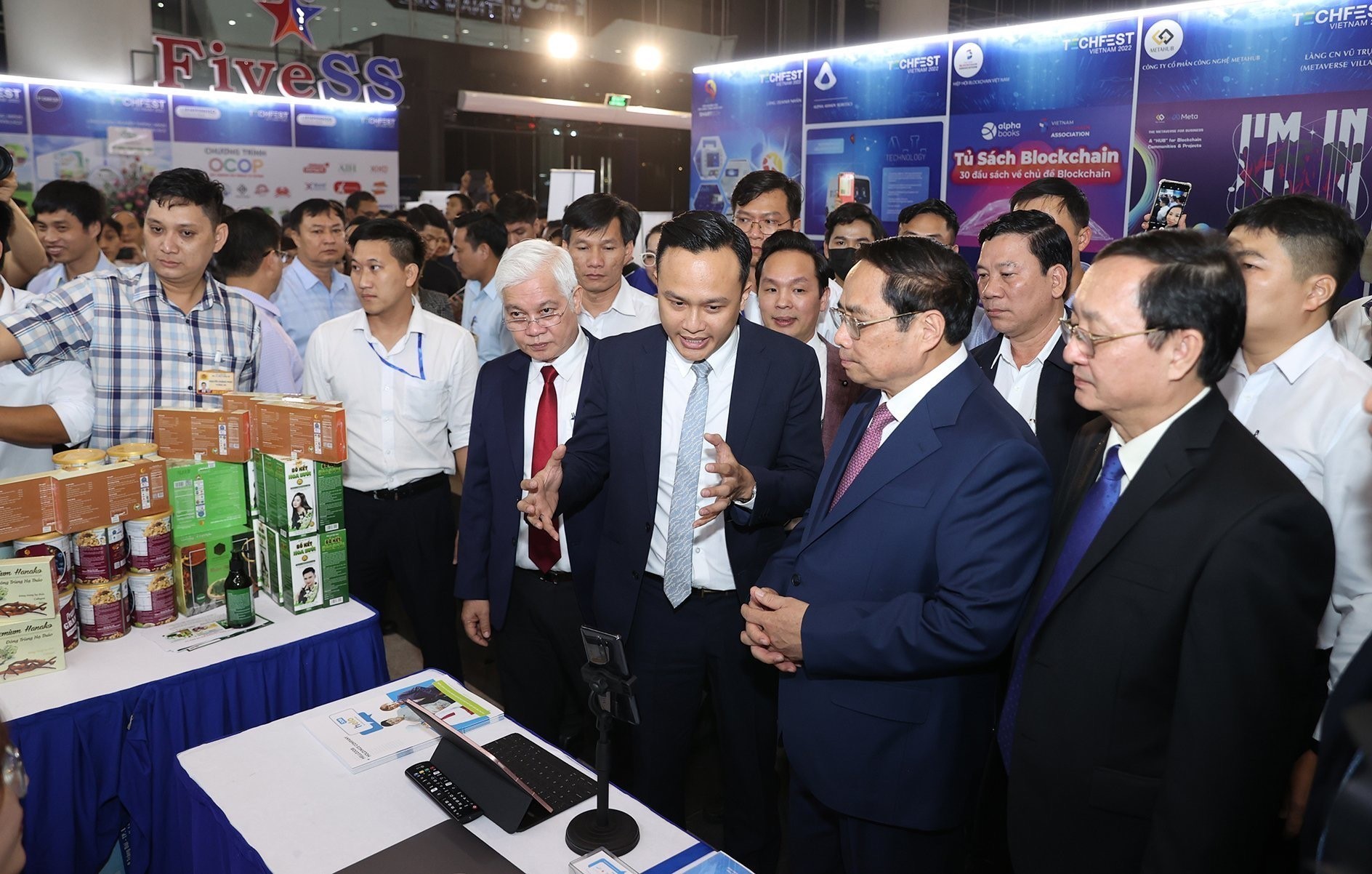 Ủy viên Bộ Chính trị, Thủ tướng Chính phủ Phạm Minh Chính tham quan các sản phẩm tại Ngày hội Khởi nghiệp đổi mới sáng tạo quốc gia (TECHFEST VIETNAM) 2022, với chủ đề “Đổi mới sáng tạo mở - Khơi nguồn tư duy mới” _Ảnh: TTXVN