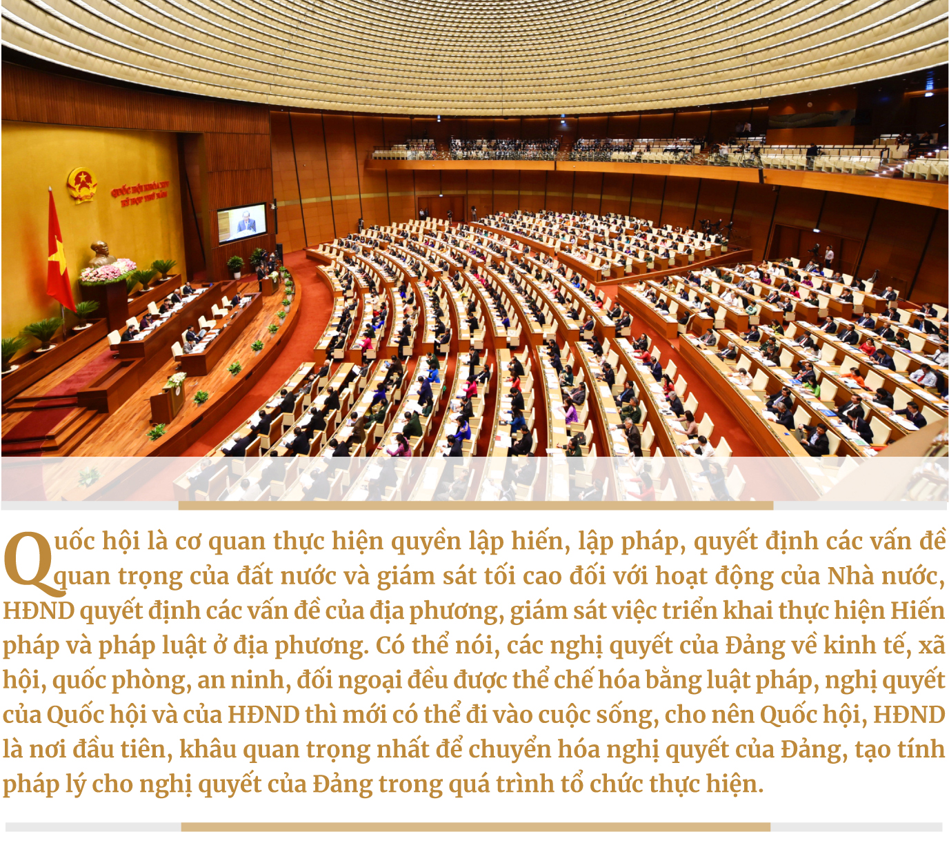 Vai trò, nhiệm vụ, vị thế của Quốc hội, HĐND và đại biểu cơ quan dân cử luôn gắn chặt hữu cơ với sự lãnh đạo và đổi mới phương thức lãnh đạo của Đảng. Đó là thực tế đã được kiểm nghiệm, minh chứng trong sự nghiệp cách mạng Việt Nam dưới sự lãnh đạo của Đảng. Nó khác hoàn toàn về bản chất với tổ chức và hoạt động của nghị viện trong các nền dân chủ phương Tây, nhất là mô hình của Tây Âu, mà đại diện lâu đời nhất là nghị viện của Anh và Pháp, xuất hiện đầu thế kỷ thứ XIV. Đó là cuộc đấu tranh giữa giai cấp tư sản với chế độ phong kiến, đứng đầu là nhà vua, về các định chế tài chính công, liên quan đến quyền thu thuế, quyền chi tiêu và hình thành ngân sách quốc gia. Quyền lực của Quốc hội ở Anh được xác lập khá đầy đủ vào năm 1689 và ở Pháp, sau nhiều thất bại, đã được giải quyết bằng cuộc Cách mạng tư sản Pháp năm 1789, nhưng mãi đến năm 1870 thời Đệ Tam Cộng hòa, vai trò của Nghị viện mới được xác lập đầy đủ. Song, bản chất của nghị viện tư sản với đa số nghị sĩ cũng chỉ đại diện cho giai cấp tư sản mà không phải cho đông đảo quần chúng lao động, còn quyền dân chủ thực chất là dân chủ tư sản. Trong chế độ phong kiến Việt Nam không có Quốc hội, còn hội đồng ở cấp địa phương trong chế độ thuộc địa, nửa phong kiến là do thực dân Pháp dựng lên. Chỉ đến khi Đảng Cộng sản Việt Nam ra đời, để thể hiện ý chí toàn dân, trước khi quyết định Tổng khởi nghĩa Tháng Tám năm 1945, Chủ tịch Hồ Chí Minh và Trung ương Đảng đã quyết định triệu tập Quốc dân Đại hội ở Tân Trào (huyện Sơn Dương, tỉnh Tuyên Quang), tiền thân của Quốc hội Việt Nam.