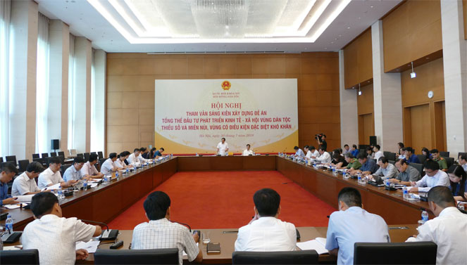 Phát biểu khai mạc Hội nghị, Chủ tịch Hội đồng Dân tộc Hà Ngọc Chiến cho biết tại Kỳ họp thứ 6 Quốc hội khóa XIV, trên cơ sở đánh giá kết quả ba năm thực hiện chính sách phát triển kinh tế - xã hội đối với vùng dân tộc thiểu số và miền núi của Chính phủ và Báo cáo thẩm tra của Hội đồng Dân tộc, Quốc hội đã giao Chính phủ xây dựng Đề án tổng thể đầu tư phát triển kinh tế-xã hội vùng dân tộc thiểu số và miền núi, vùng có điều kiện đặc biệt khó khăn; trình Quốc hội xem xét quyết định tại Kỳ họp thứ 8, Quốc hội khóa XIV, tháng 10-2019, để thực hiện Đề án vào năm 2021.