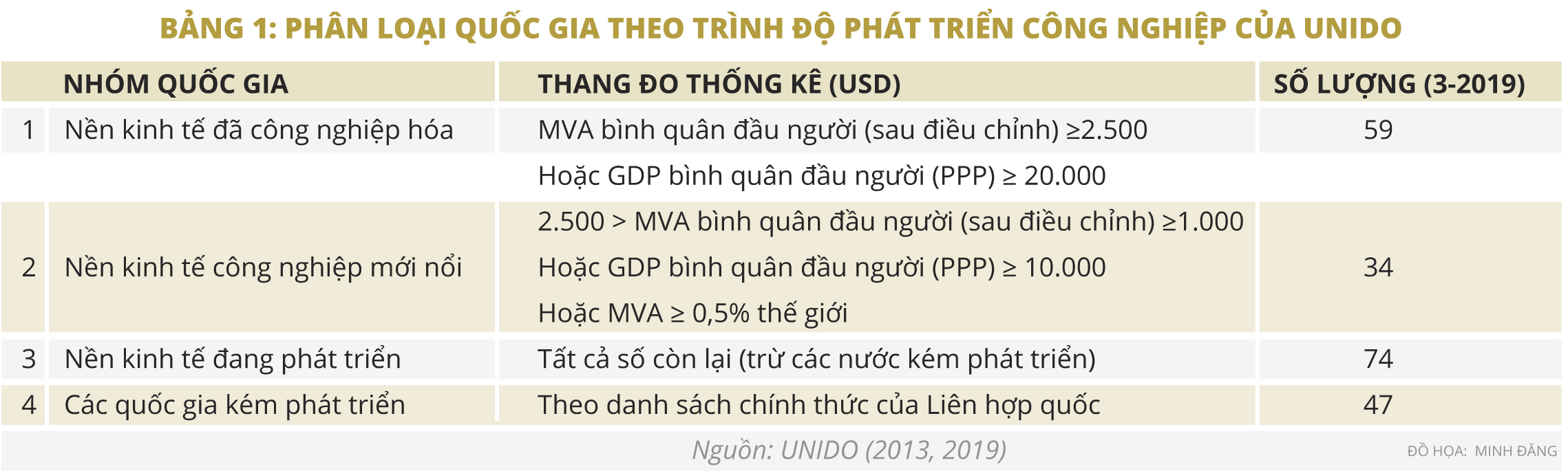 Một quốc gia được xếp hạng là “nền kinh tế công nghiệp mới nổi” nếu quốc gia đó đã có những thành tựu đáng kể về công nghiệp hóa và có MVA bình quân đầu người sau điều chỉnh nằm trong khoảng từ 1.000 USD đến 2.500 USD, hoặc GDP bình quân đầu người từ khoảng 10.000 USD đến 20.000 USD. Một tiêu chí nữa đã được đưa vào định nghĩa để bổ sung vào danh sách một số nền kinh tế đóng góp lớn cho sản xuất công nghiệp toàn cầu. Về tuyệt đối, các quốc gia này có đầy đủ các tiêu chí trên của một nền kinh tế công nghiệp mới nổi, nhưng về tương đối, do quy mô dân số lớn nên chưa đạt được mức MVA bình quân đầu người như các quốc gia khác. Vì vậy, danh sách này có bao gồm cả các công xưởng lớn của thế giới (đóng góp 0,5% hoặc nhiều hơn MVA toàn cầu), như Ấn Độ và Trung Quốc. Bảng phân loại quốc gia dựa trên trình độ công nghiệp hóa bao gồm 4 nhóm chính, với các ngưỡng thống kê và tiêu chí cụ thể như sau (xem Bảng 1):