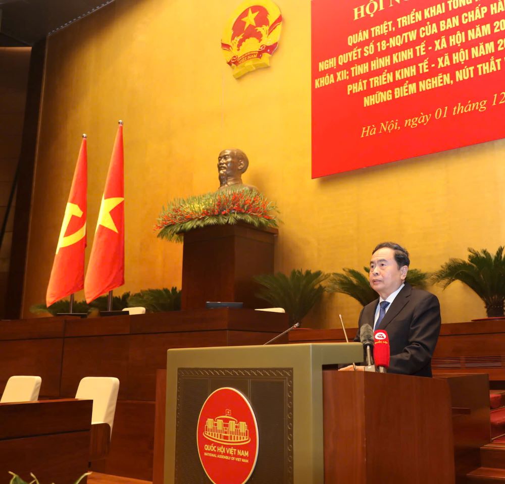 Trình bày chuyên đề "Tháo gỡ những điểm nghẽn, nút thắt về thể chế", Ủy viên Bộ Chính trị, Chủ tịch Quốc hội Trần Thanh Mẫn cho biết, tại Kỳ họp thứ 8, Quốc hội khóa XV, ngày 30-11-2024, Quốc hội đã biểu quyết thông qua 18 luật, xem xét, thông qua 21 nghị quyết, trong đó có 4 nghị quyết quy phạm pháp luật luật với tỷ lệ tán thành cao; Quốc hội cũng đã cho ý kiến lần đầu đối với 10 dự án luật khác. Kế thừa, phát huy những ưu điểm, bài học kinh nghiệm của các nhiệm kỳ Quốc hội trước đây; lắng nghe ý kiến của các chuyên gia, nhà quản lý, doanh nghiệp, các tầng lớp nhân dân, đặc biệt là qua thực tiễn hoạt động; Quốc hội, Ủy ban Thường vụ Quốc hội đã có những đổi mới ngay từ khâu chuẩn bị cho Kỳ họp thứ 8, Quốc hội khóa XV.