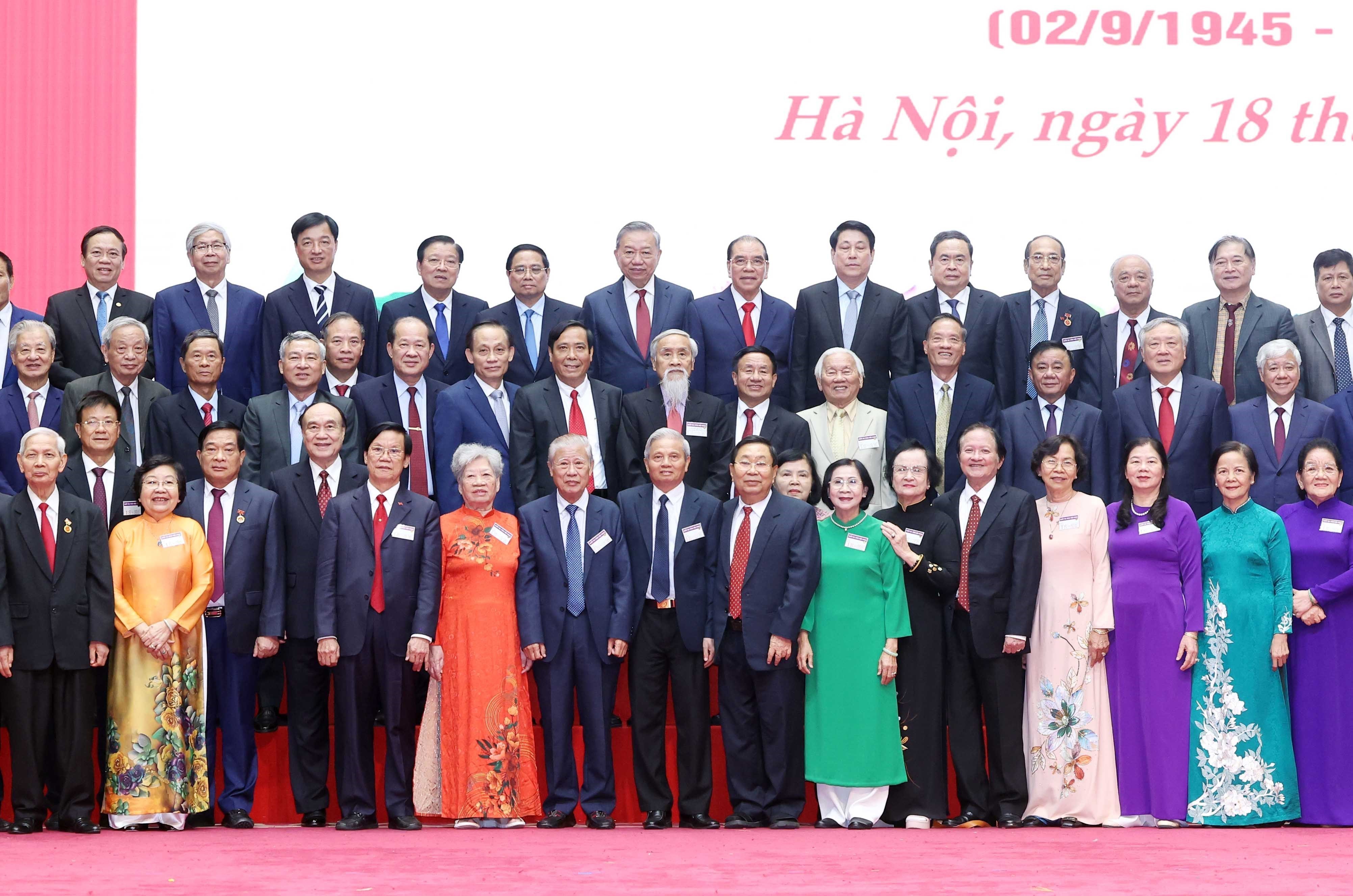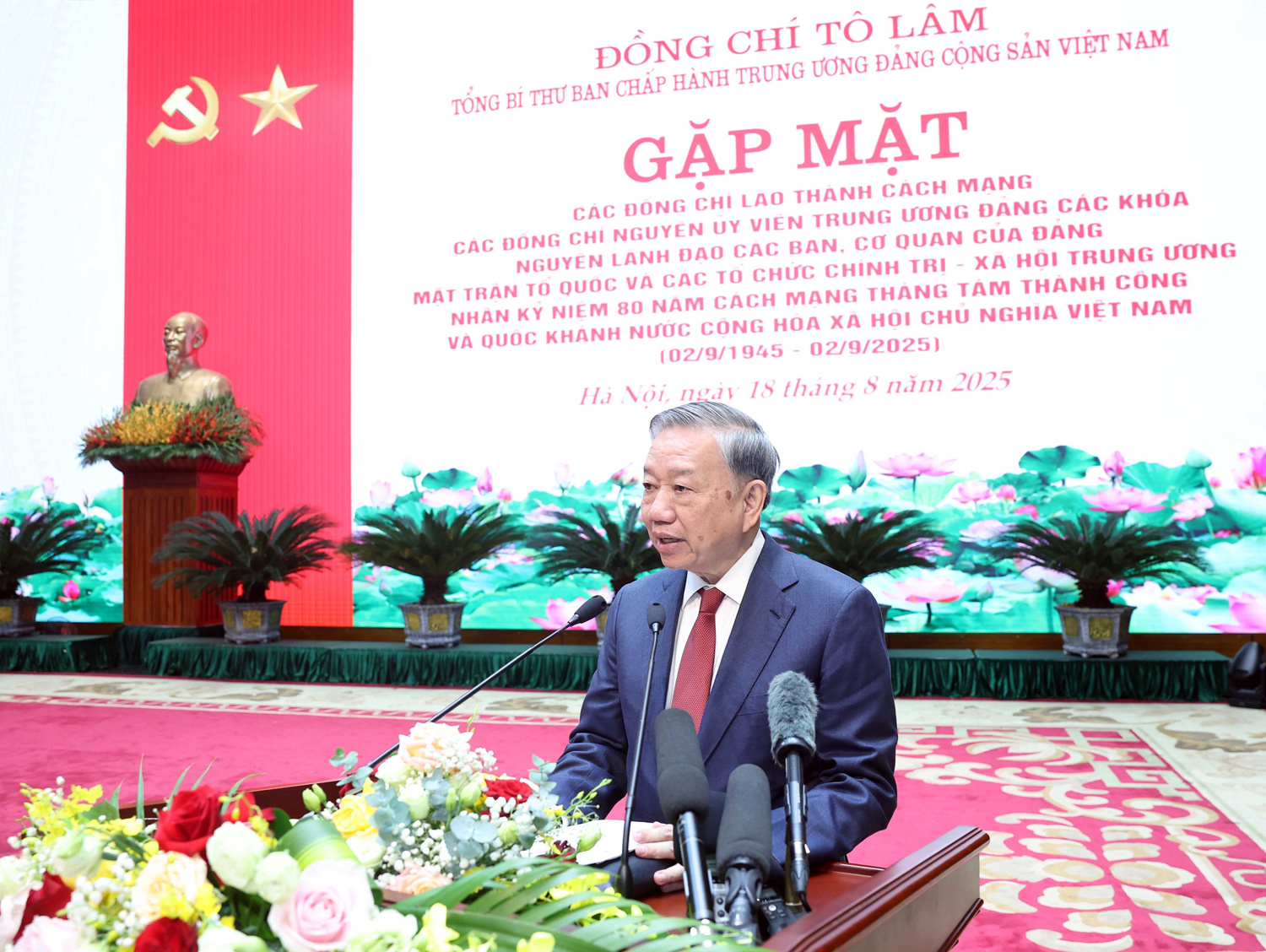 TCCS - Nhân kỷ niệm 80 năm Cách mạng Tháng Tám thành công (19-8-1945 -19-8-2025) và Quốc khánh nước Cộng hòa xã hội chủ nghĩa Việt Nam (2-9-1945 - 2-9-2025), ngày 18-8-2025, tại Hà Nội, Tổng Bí thư Tô Lâm gặp mặt các đồng chí lão thành cách mạng, nguyên Ủy viên Trung ương Đảng các khóa, nguyên lãnh đạo các ban, cơ quan của Đảng, Mặt trận Tổ quốc và các tổ chức chính trị - xã hội ở Trung ương.