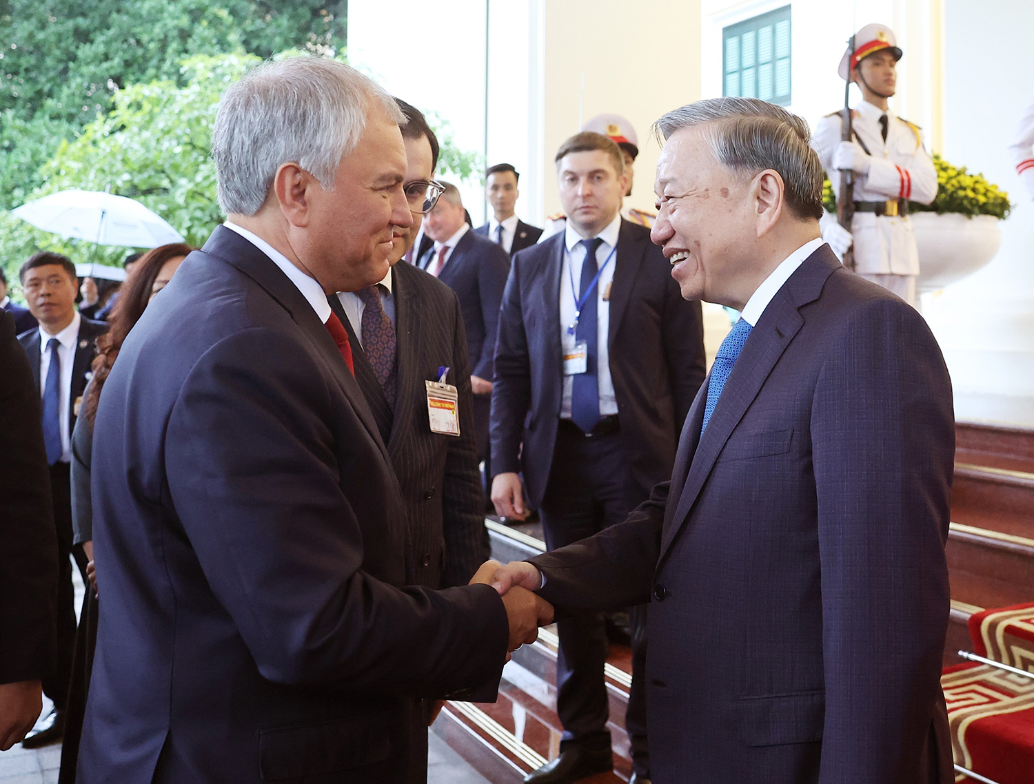 Chủ tịch Duma Quốc gia Quốc hội Nga Vyacheslav Volodin bày tỏ vui mừng được gặp lại Tổng Bí thư Tô Lâm kể từ chuyến thăm chính thức Nga vào tháng 5-2025; đánh giá cao vai trò và đóng góp của Tổng Bí thư đối với quan hệ hai nước, ý nghĩa của chuyến thăm trong giai đoạn hợp tác mới; chuyển lời chào và lời thăm hỏi chân thành nhất của Tổng thống Putin, Chủ tịch Đảng Cộng sản Nga Zyuganov, lãnh đạo các đảng chính trị Nga tới Tổng Bí thư Tô Lâm và bày tỏ mong muốn Tổng Bí thư Tô Lâm sẽ thăm Duma Quốc gia trong chuyến thăm tiếp theo của Tổng Bí thư đến Nga, khẳng định các nhà lãnh đạo và đại biểu Duma Quốc gia luôn là những người bạn của Tổng Bí thư.