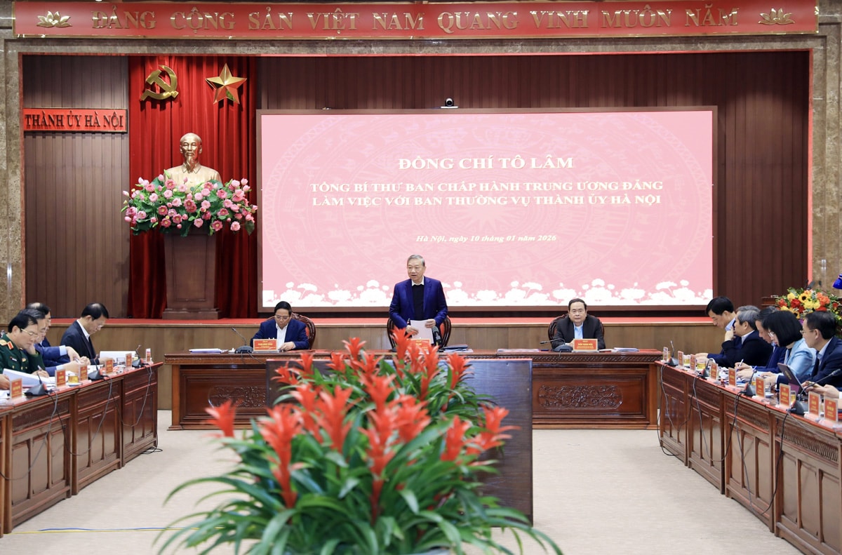 TCCS - Ngày 10-1-2026, Tổng Bí thư Tô Lâm chủ trì buổi làm việc với Ban Thường vụ Thành ủy Hà Nội về đề xuất xây dựng Quy hoạch Thủ đô tầm nhìn 100 năm gắn với hoàn thiện thể chế đáp ứng yêu cầu phát triển; dự kiến mô hình phát triển kinh tế - xã hội và thực hiện mục tiêu tăng trưởng hai con số.