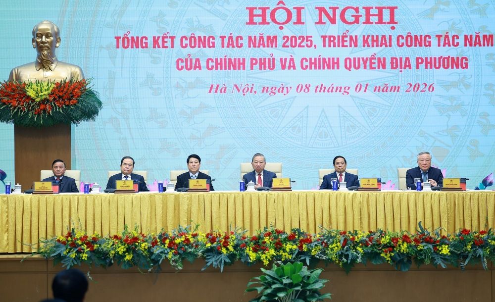 TCCS - Ngày 8-1-2025, tại trụ sở Chính phủ, Chính phủ tổ chức Hội nghị tổng kết công tác năm 2025, triển khai công tác năm 2026 của Chính phủ và chính quyền địa phương. Hội nghị được tổ chức trực tiếp kết hợp trực tuyến với điểm cầu 34 tỉnh, thành phố trong cả nước. Tổng Bí thư Tô Lâm dự và phát biểu chỉ đạo hội nghị.