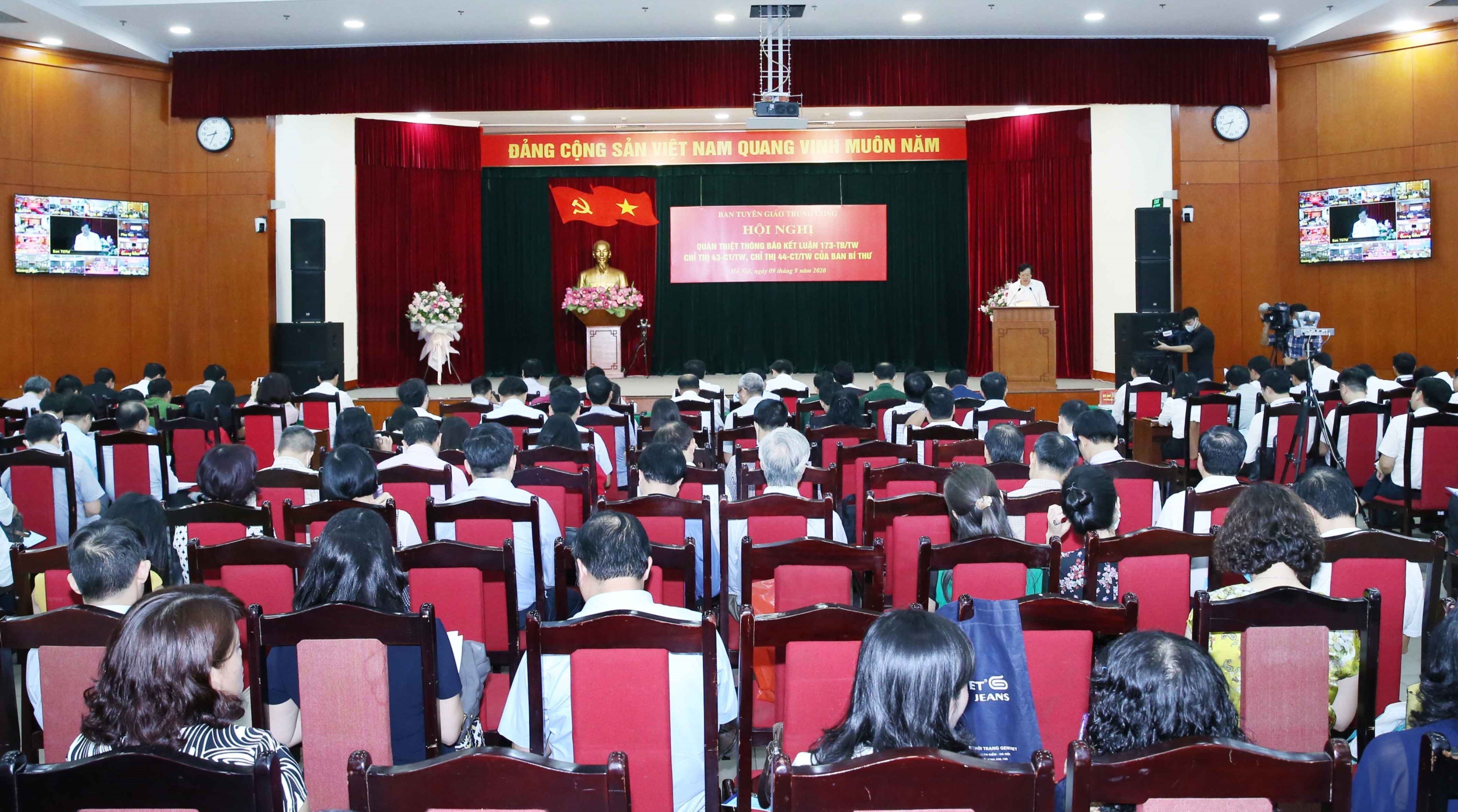 TCCS - Ngày 9-9-2020, Ban Tuyên giáo Trung ương phối hợp với Tạp chí Cộng sản, Báo Nhân dân, Hội Nhà báo Việt Nam tổ chức hội nghị trực tuyến toàn quốc tới 283 điểm cầu trong cả nước, quán triệt các văn bản chỉ đạo của Ban Bí thư: Thông báo Kết luận số 173-TB/TW, tiếp tục thực hiện Chỉ thị số 11-CT/TW về việc mua, đọc báo, tạp chí của Đảng; Chỉ thị số 43-CT/TW, của Ban Bí thư về tăng cường sự lãnh đạo của Đảng đối với hoạt động của Hội Nhà báo Việt Nam; Chỉ thị số 44-CT/TW, của Ban Bí thư về đổi mới, nâng cao chất lượng, hiệu quả công tác xuất bản, phát hành và nghiên cứu, học tập sách lý luận, chính trị.