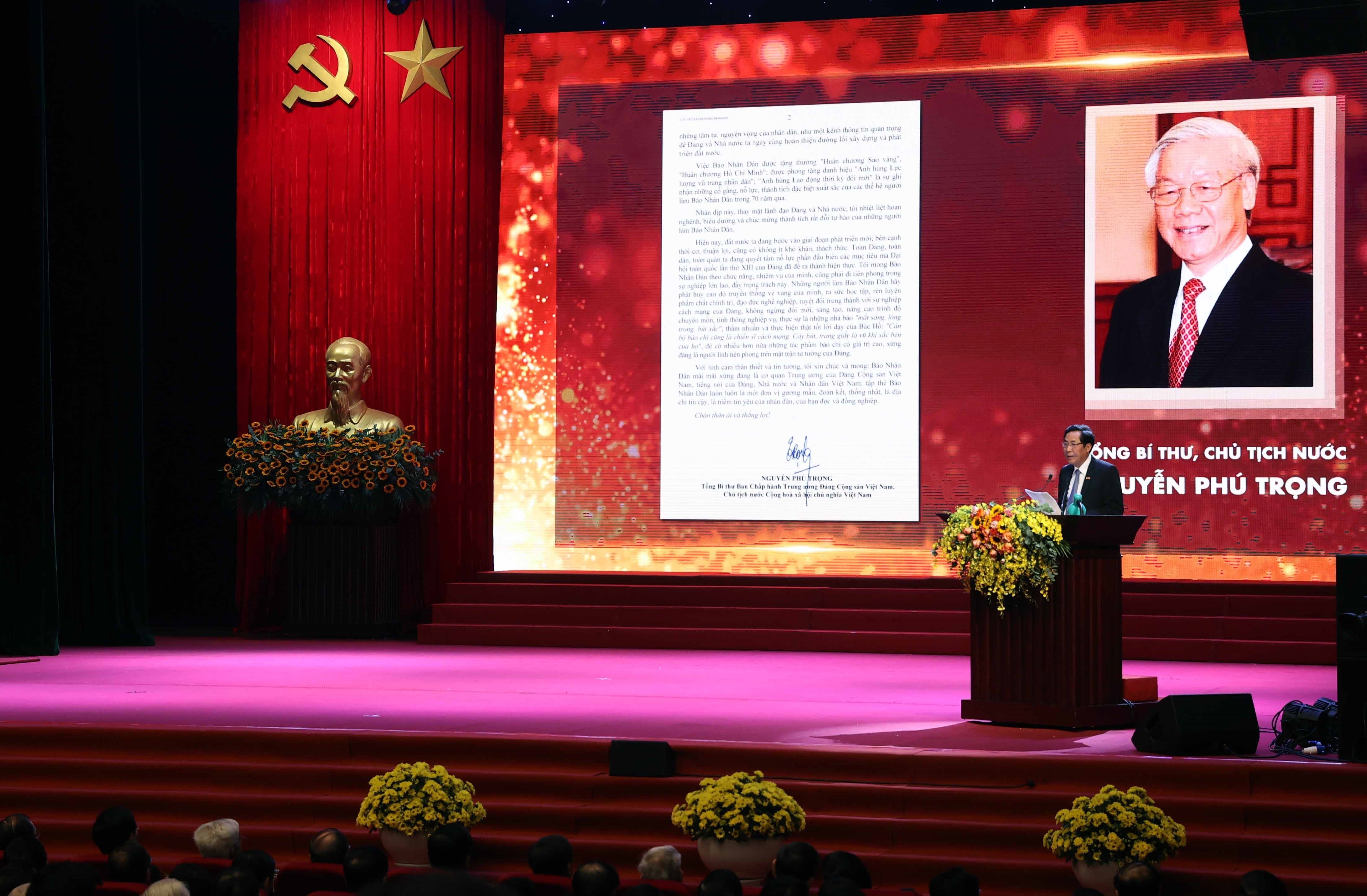 Tại buổi lễ, Tổng Biên tập Báo Nhân dân, Phó Trưởng Ban Tuyên giáo Trung ương, Chủ tịch Hội Nhà báo Việt Nam Thuận Hữu đọc thư của Tổng Bí thư, Chủ tịch nước Nguyễn Phú Trọng gửi Báo Nhân dân dịp kỷ niệm 70 năm Ngày ra số đầu.