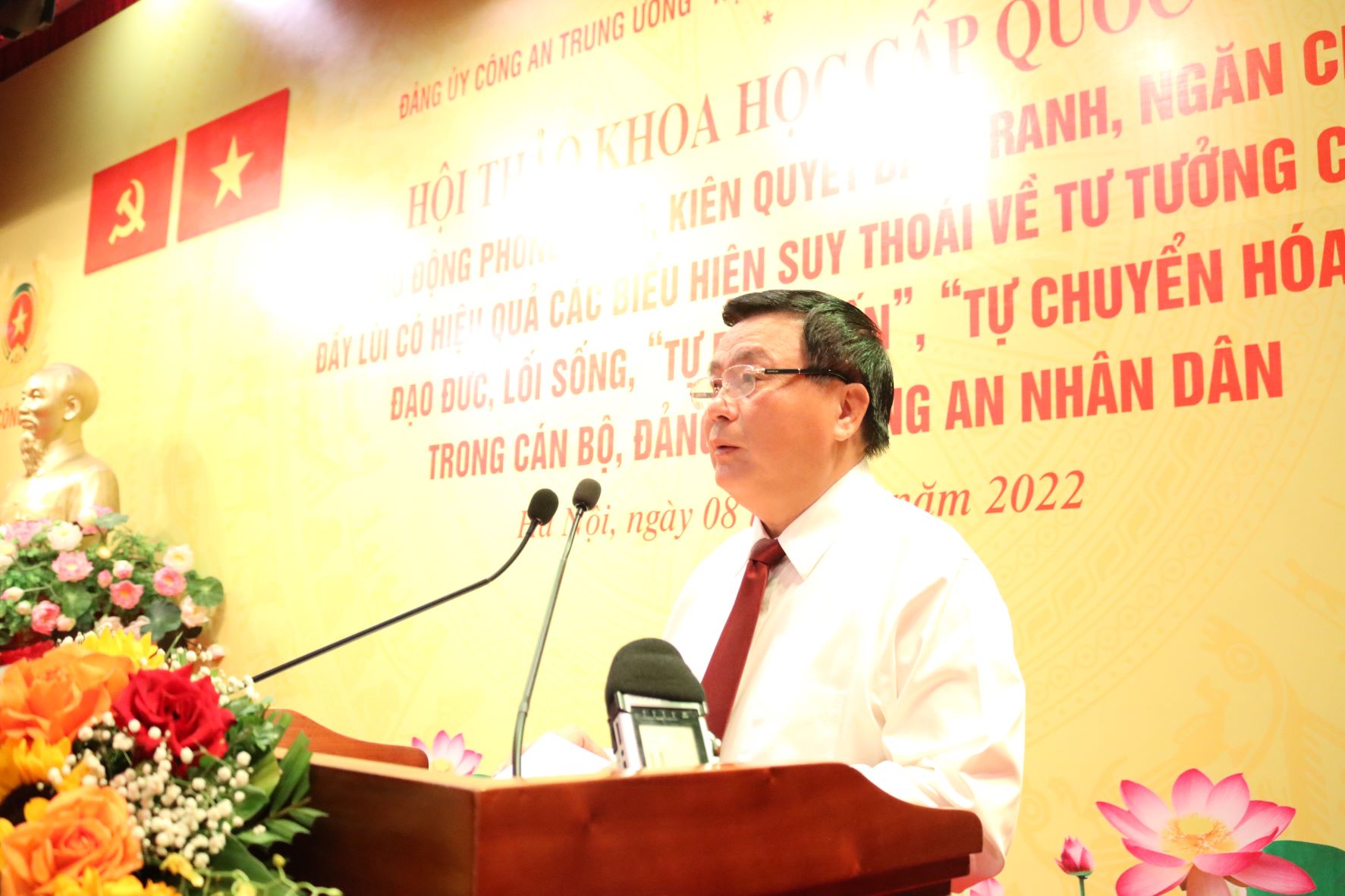 TCCS - Quán triệt Kết luận số 21-KL/TW, của Hội nghị Trung ương 4 khóa XIII, về “Đẩy mạnh xây dựng, chỉnh đốn Đảng và hệ thống chính trị; kiên quyết ngăn chặn, đẩy lùi, xử lý nghiêm cán bộ, đảng viên suy thoái về tư tưởng chính trị, đạo đức, lối sống, biểu hiện “tự diễn biến”, “tự chuyển hóa””, ngày 8-8-2022, tại Hà Nội, Đảng ủy Công an Trung ương phối hợp với Học viện Chính trị quốc gia Hồ Chí Minh tổ chức Hội thảo khoa học cấp quốc gia: “Chủ động phòng ngừa, kiên quyết đấu tranh, ngăn chặn, đẩy lùi có hiệu quả các biểu hiện suy thoái về tư tưởng chính trị, đạo đức, lối sống, “tự diễn biến”, “tự chuyển hóa” trong cán bộ, đảng viên Công an nhân dân”.