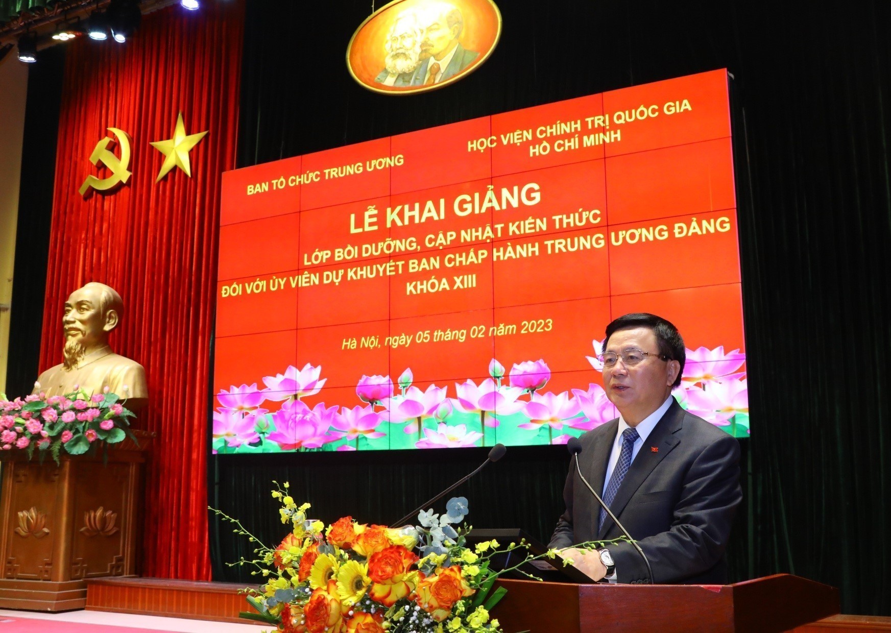 TCCS - Ngày 5-2-2023, tại Hà Nội, Học viện Chính trị quốc gia Hồ Chí Minh phối hợp với Ban Tổ chức Trung ương tổ chức khai giảng Lớp bồi dưỡng, cập nhật kiến thức đối với Ủy viên dự khuyết Ban Chấp hành Trung ương Đảng khóa XIII. Ủy viên Bộ Chính trị, Thường trực Ban Bí thư Võ Văn Thưởng dự và phát biểu chỉ đạo.