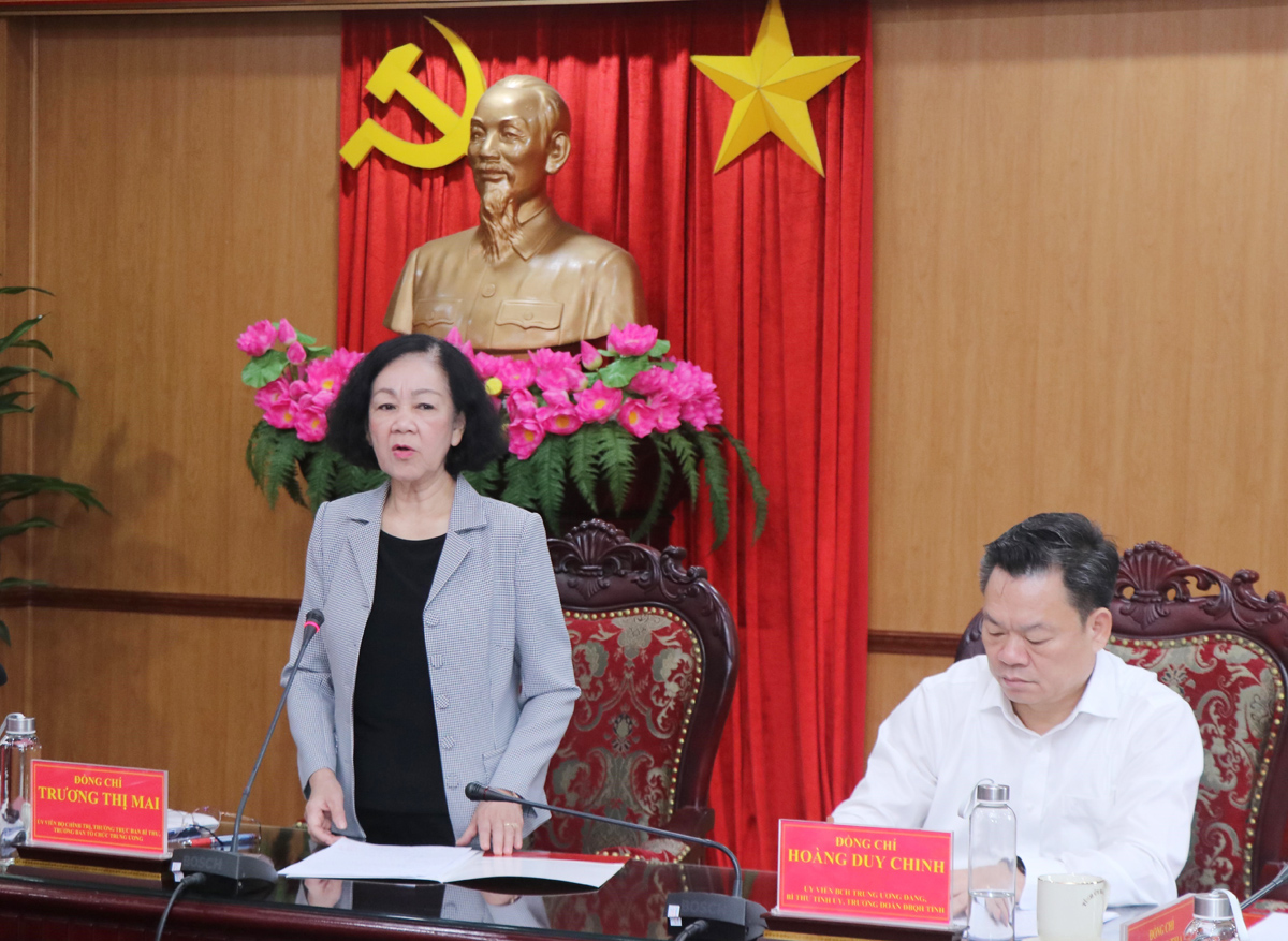 Phát biểu tại buổi làm việc, Thường trực Ban Bí thư Trương Thị Mai ghi nhận kết quả trên các mặt kinh tế - xã hội và xây dựng Đảng tỉnh Bắc Kạn đã đạt được trong thời gian qua.