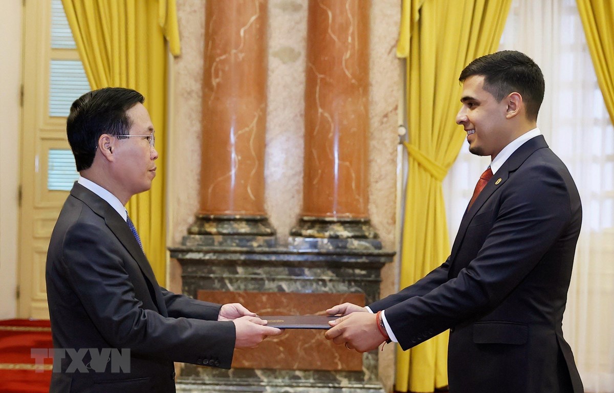 Ủy viên Bộ Chính trị, Chủ tịch nước Võ Văn Thưởng nhận quốc thư của Đại sứ Venezuela Juan Carlos Fernandes Juarez_Ảnh: TTXVN