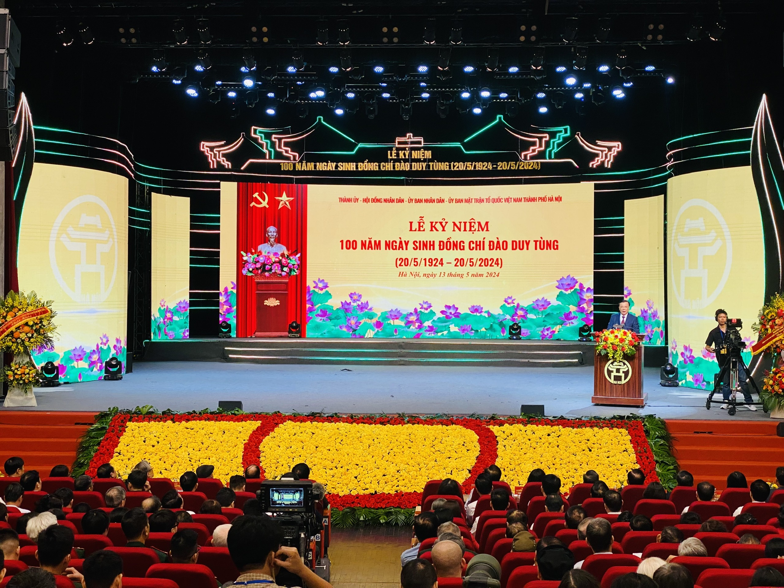 TCCS - Ngày 13-5-2024, Thành ủy, Hội đồng nhân dân, Ủy ban nhân dân, Ủy ban Mặt trận Tổ quốc Việt Nam thành phố Hà Nội trang trọng tổ chức Lễ kỷ niệm 100 năm Ngày sinh đồng chí Đào Duy Tùng (20-5-1924 - 20-5-2024) - nhà lãnh đạo cấp cao của Đảng, người chiến sĩ cộng sản xuất sắc, trung thành, tận tụy, suốt đời chiến đấu vì lý tưởng cách mạng, người con ưu tú của Thủ đô.