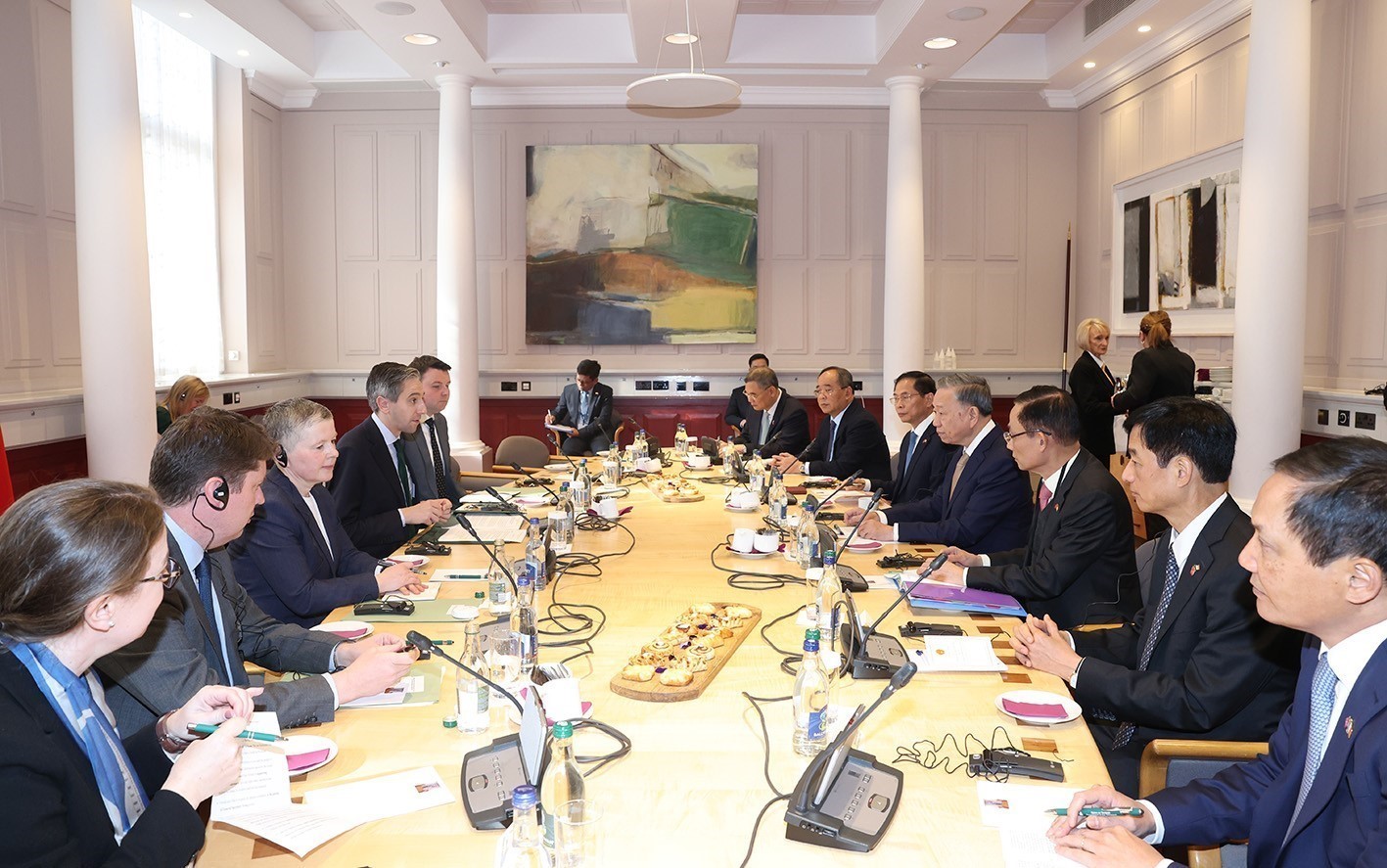 Tổng Bí thư, Chủ tịch nước Tô Lâm vui mừng thông báo với Thủ tướng Simon Harris việc Chính phủ Việt Nam đã quyết định và đang tiến hành các bước mở Đại sứ quán Việt Nam tại Ireland nhằm đóng góp tích cực vào sự phát triển của quan hệ hai nước. Về hợp tác kinh tế, Tổng Bí thư, Chủ tịch nước Tô Lâm đề nghị hai bên cần tiếp tục phối hợp chặt chẽ, tận dụng hiệu quả Hiệp định Thương mại tự do Việt Nam - EU (EVFTA), trong đó có việc xem xét tạo thuận lợi cho các mặt hàng xuất khẩu thế mạnh của mỗi nước tiếp cận thị trường của nhau; hoan nghênh Ireland có chính sách khuyến khích, tạo thuận lợi cho doanh nghiệp Ireland tăng cường đầu tư vào Việt Nam trong các lĩnh vực thế mạnh, như chuyển đổi số, năng lượng tái tạo, nông nghiệp công nghệ cao… Tổng Bí thư, Chủ tịch nước Tô Lâm cũng đề nghị Ireland sớm hoàn tất thủ tục phê chuẩn Hiệp định Bảo hộ đầu tư Việt Nam – EU (EVIPA) nhằm tạo thuận lợi cho quan hệ đầu tư bình đẳng, cùng có lợi giữa hai bên.