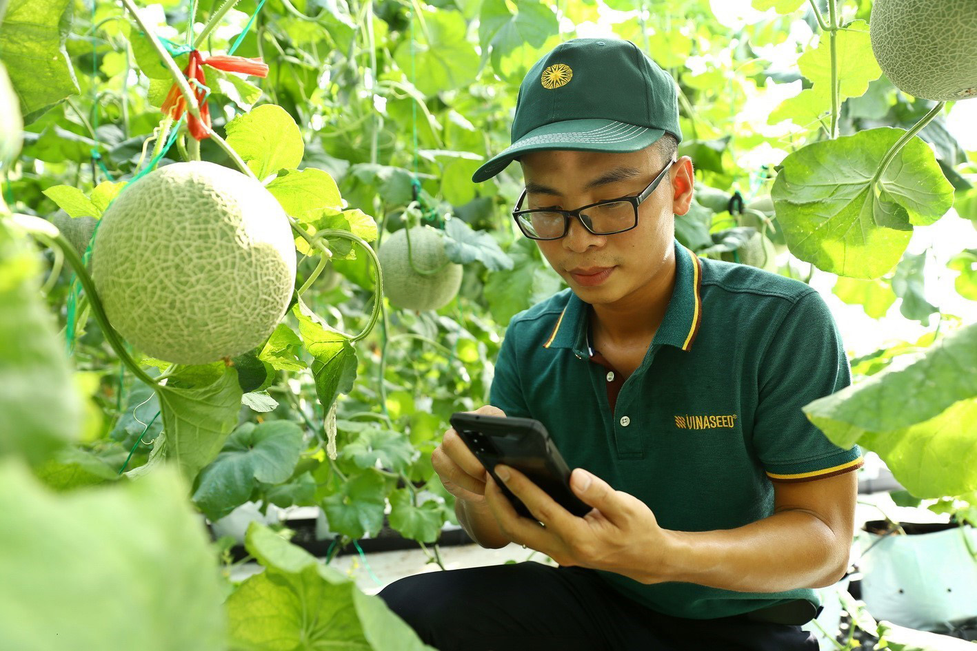 Mô hình nông nghiệp công nghệ cao tại Hà Nam Hightech ứng dụng hệ thống công nghệ nhà màng, điều khiển lưu lượng tưới, dinh dưỡng qua smartphone_Ảnh: TTXVN
