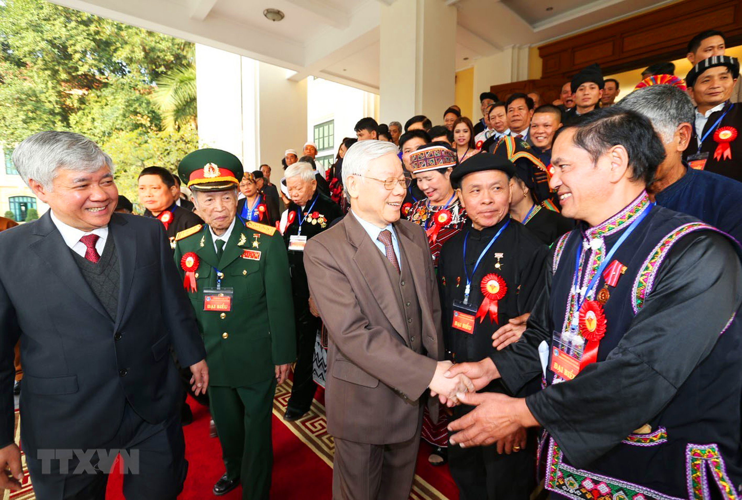 Tổng Bí thư Nguyễn Phú Trọng với các đại biểu người có uy tín, nhân sĩ, trí thức, doanh nhân dân tộc thiểu số tiêu biểu toàn quốc (năm 2017) _Nguồn: vietnamplus.vn