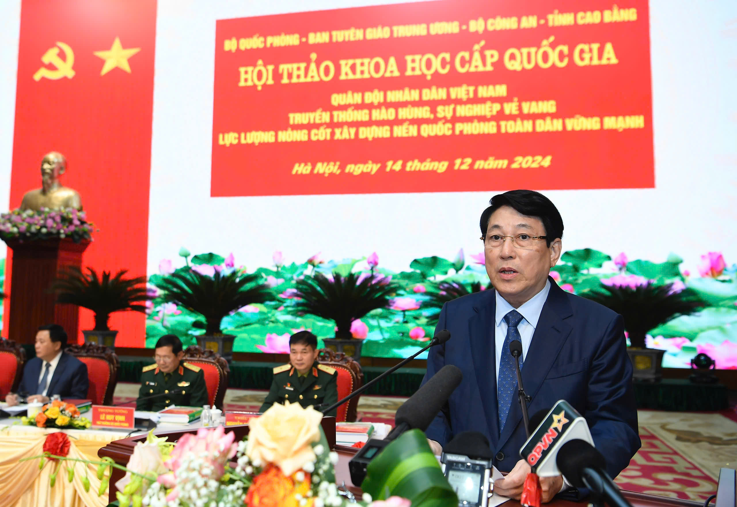 Phát biểu chỉ đạo hội thảo, đồng chí Lương Cường khẳng định, 80 năm qua, dưới sự lãnh đạo tuyệt đối, trực tiếp về mọi mặt của Đảng Cộng sản Việt Nam, sự quản lý tập trung, thống nhất của Nhà nước, sự phối hợp chặt chẽ, có hiệu quả của các ban, bộ, ngành, đoàn thể trung ương và địa phương, sự yêu thương, đùm bọc, giúp đỡ của Nhân dân, kế thừa, phát huy truyền thống yêu nước và tinh hoa nghệ thuật quân sự Việt Nam, Quân đội nhân dân Việt Nam đã vượt qua muôn vàn khó khăn, thách thức, nhanh chóng trưởng thành, đi khắp từ Nam chí Bắc trên đất nước Việt Nam và làm nhiệm vụ quốc tế trên đất nước bạn, đánh bại thực dân Pháp, đế quốc Mỹ và các thế lực xâm lược, thù địch, ghi dấu ấn trong lịch sử bằng những chiến công lừng lẫy, tiêu biểu là Chiến dịch Điện Biên Phủ “lừng lẫy năm châu, chấn động địa cầu" và Đại thắng mùa Xuân năm 1975, đưa cả nước thống nhất đi lên chủ nghĩa xã hội, đã anh dũng chiến đấu bảo vệ toàn vẹn lãnh thổ ở biên giới phía Tây Nam và biên giới phía Bắc của Tổ quốc, giữ vững độc lập, chủ quyền và thống nhất, toàn vẹn lãnh thổ của Tổ quốc.