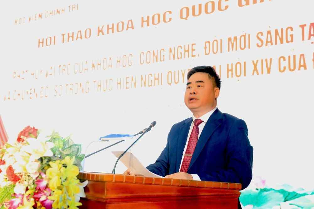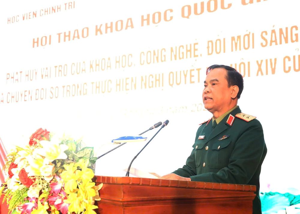 Phát biểu khai mạc hội thảo, Trung tướng, PGS, TS Nguyễn Bá Hùng, Chính ủy Học viện Chính trị cho biết, Đại hội XIV của Đảng là dấu mốc có ý nghĩa đặc biệt trọng đại trong tiến trình phát triển của đất nước, mở ra kỷ nguyên phát triển mới của dân tộc Việt Nam, với khát vọng xây dựng đất nước phồn vinh, hạnh phúc, có vị thế ngày càng cao trên trường quốc tế. Nghị quyết Đại hội XIV của Đảng đã xác định rõ những quan điểm, mục tiêu, nhiệm vụ và giải pháp chiến lược nhằm phát huy tối đa nội lực, tranh thủ hiệu quả ngoại lực, trong đó khoa học, công nghệ, đổi mới sáng tạo và chuyển đổi số được khẳng định là động lực chính để thúc đẩy đất nước phát triển nhanh và bền vững, là trụ cột trong chiến lược phát triển quốc gia, là yếu tố quyết định nâng cao năng lực cạnh tranh, khẳng định vị thế, uy tín Việt Nam trong chuỗi giá trị toàn cầu.