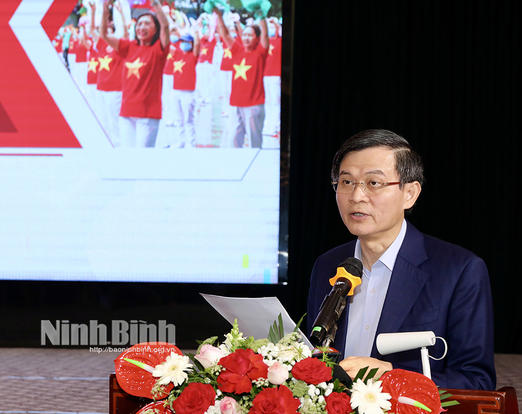 Phát biểu chào mừng tại hội thảo, đồng chí Đoàn Minh Huấn thông tin khái quát về lịch sử, vị trí địa lý và tình hình phát triển kinh tế - xã hội của tỉnh Ninh Bình; một số kết quả nổi bật, toàn diện mà Ninh Bình đạt được, quyết tâm phấn đấu xây dựng và phát triển tỉnh Ninh Bình trở thành thành phố trực thuộc Trung ương với đặc trưng đô thị di sản thiên niên kỷ, thành phố sáng tạo...