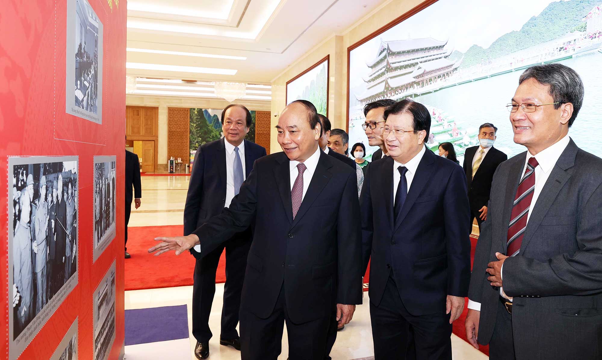 Ủy viên Bộ Chính trị, Thủ tướng Chính phủ Nguyễn Xuân Phúc và các đại biểu tham quan một số hình ảnh trưng bày_Ảnh: TTXVN