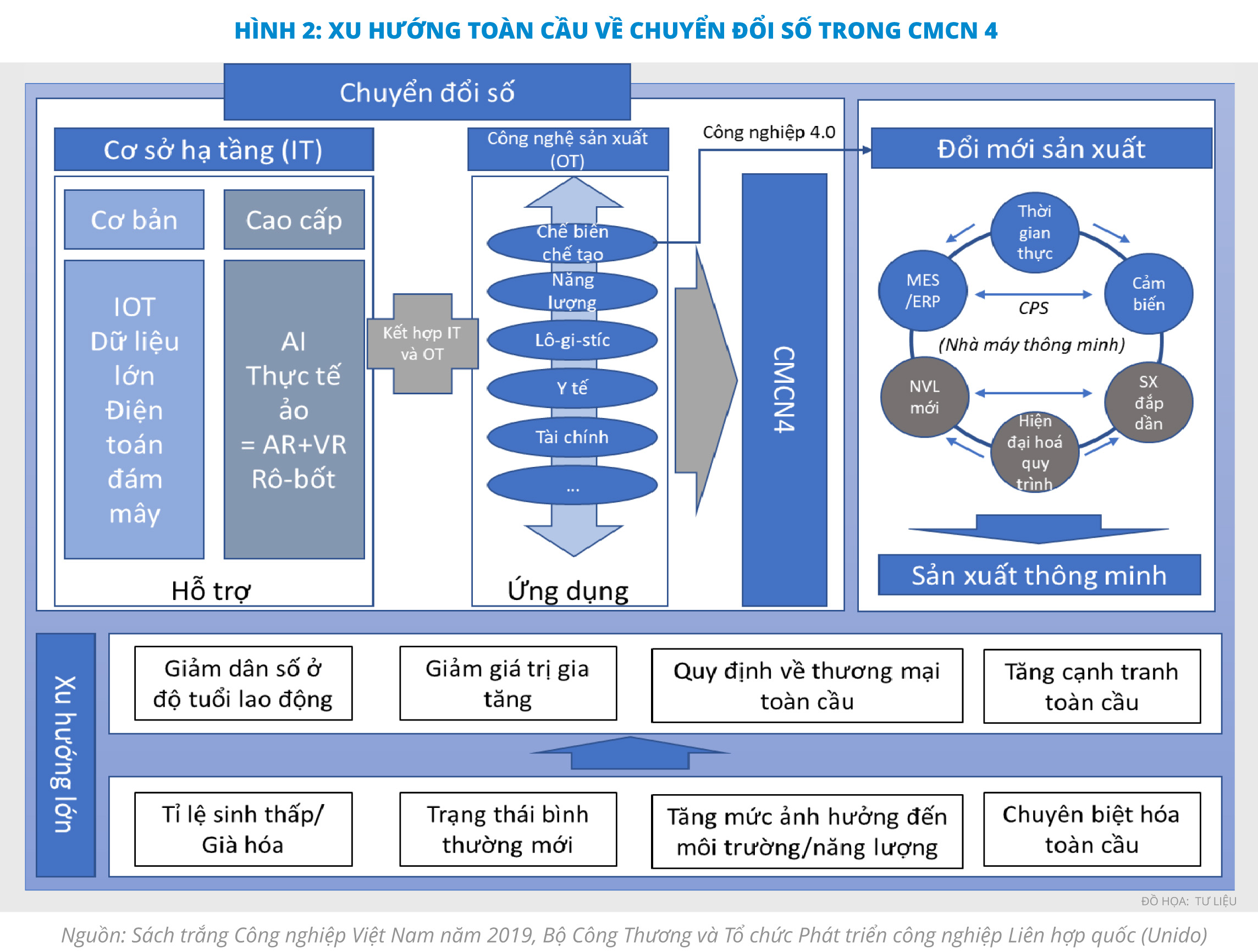 Sách trắng Công nghiệp Việt Nam năm 2019 đã khái quát toàn bộ xu hướng toàn cầu về chuyển đổi số đang diễn ra trong CMCN4. Quá trình chuyển đổi số tổng thể diễn ra nhờ mọi vật được kết nối với in-tơ-nét, nhờ sự kết hợp giữa công nghệ sản xuất (OT) với công nghệ thông tin (IT), tạo ra một thế giới ảo là bản sao của thế giới thực và một mô hình sản xuất - tiêu dùng hoàn toàn mới. Sự kết hợp giữa OT và IT là vấn đề cốt lõi của quá trình chuyển đổi số, IT tạo ra môi trường hỗ trợ cho phép hiện thực hóa việc chuyển đổi số (enabler), OT là các công nghệ cơ bản trong mọi lĩnh vực của đời sống, sản xuất, năng lượng, lô-gi-stíc, y tế, tài chính... là nền tảng để đưa công nghệ thông tin vào ứng dụng trong thực tiễn (adopter). Một quốc gia chưa có OT phát triển mạnh thì cũng sẽ không tạo ra nhiều cơ hội, môi trường rộng lớn để ứng dụng IT, do vậy, cả OT và IT đều cần được quan tâm phát triển trong bối cảnh của CMCN4, đặc biệt ở các nước đang phát triển khi OT chưa phát triển mạnh mẽ và đa dạng hóa như ở các nước phát triển. Điều này một lần nữa cho thấy vai trò và tầm quan trọng của IT nói riêng và các ngành dịch vụ nói chung trong nền kinh tế đang ngày càng trở nên đậm nét hơn, nhưng dù có quan trọng đến đâu thì IT vẫn không thể thay thế hoàn toàn được OT, OT là điều kiện cần và IT là điều kiện đủ để tạo nên cuộc CMCN4.
