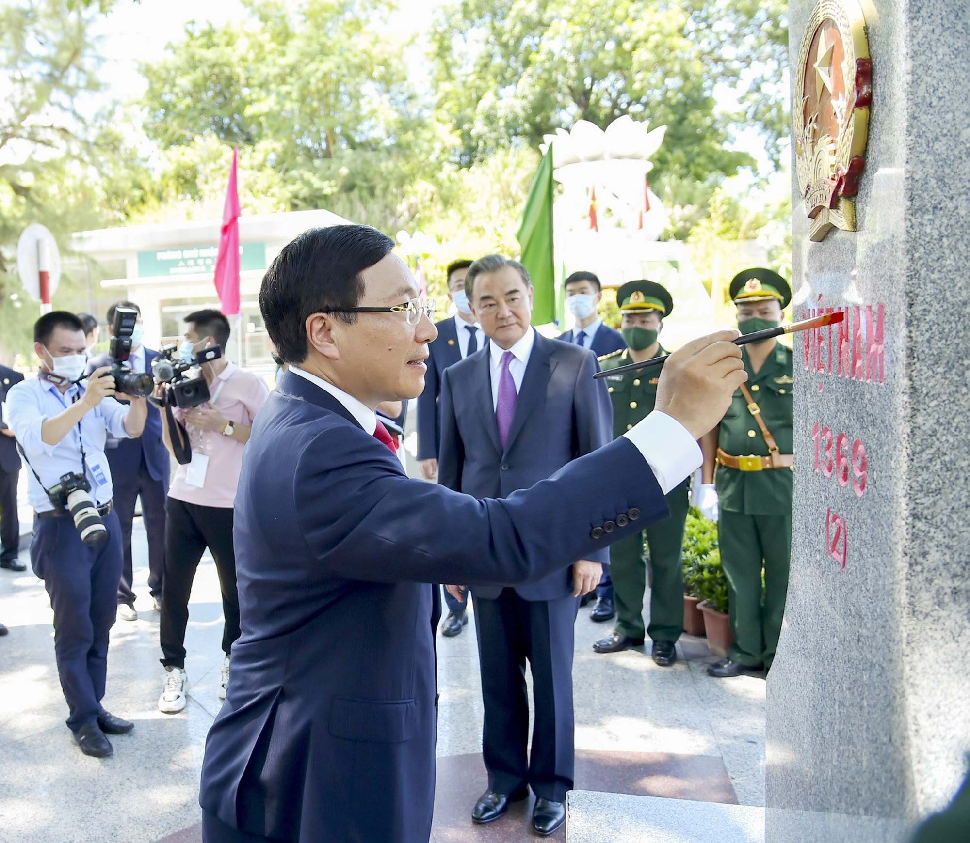 Ủy viên Bộ Chính trị, Phó Thủ tướng Chính phủ, Bộ trưởng Bộ Ngoại giao Phạm Bình Minh tô sơn lên cột mốc 1369 Việt Nam, dưới sự chứng kiến của Bộ trưởng Ngoại giao Trung Quốc Vương Nghị trong Lễ kỷ niệm 20 năm ký Hiệp ước Biên giới và 10 năm triển khai văn kiện pháp lý về biên giới trên đất liền Việt Nam - Trung Quốc tại thành phố Móng Cái (tỉnh Quảng Ninh), ngày 23-8-2020 _Ảnh: TTXVN