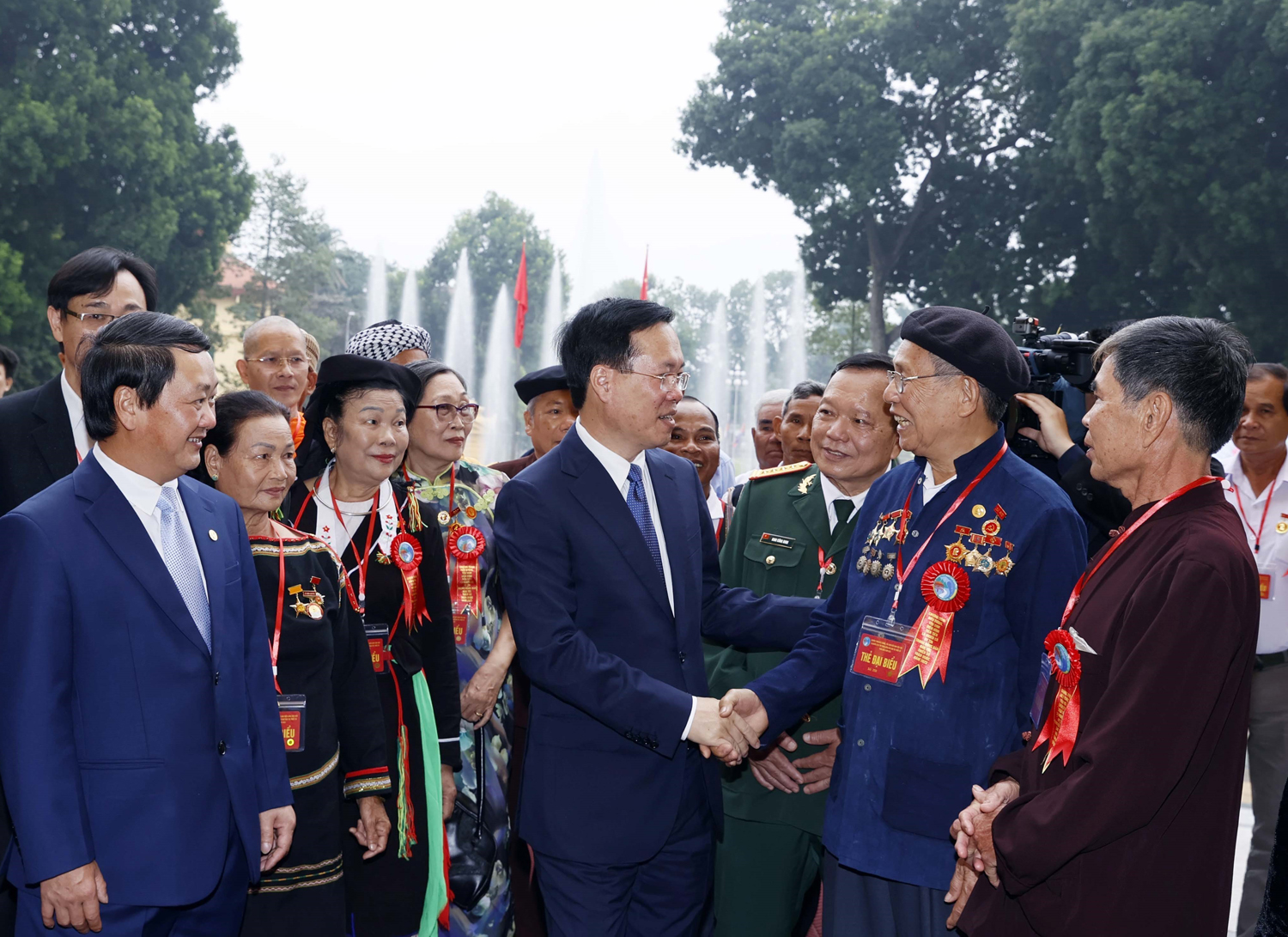 Ủy viên Bộ Chính trị, Chủ tịch nước Võ Văn Thưởng gặp mặt Đoàn đại biểu người có uy tín trong đồng bào dân tộc thiểu số toàn quốc _Ảnh: TTXVN