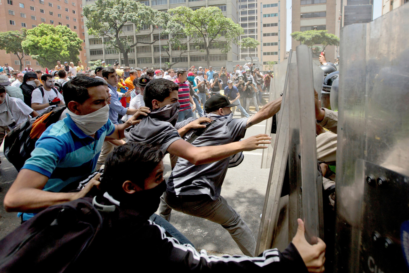 Lực lượng đối lập được phương Tây hậu thuẫn biểu tình chống chính phủ đụng độ với cảnh sát chống bạo động trong ở Caracas, Venezuela (năm 2017) _Nguồn: nytimes.com