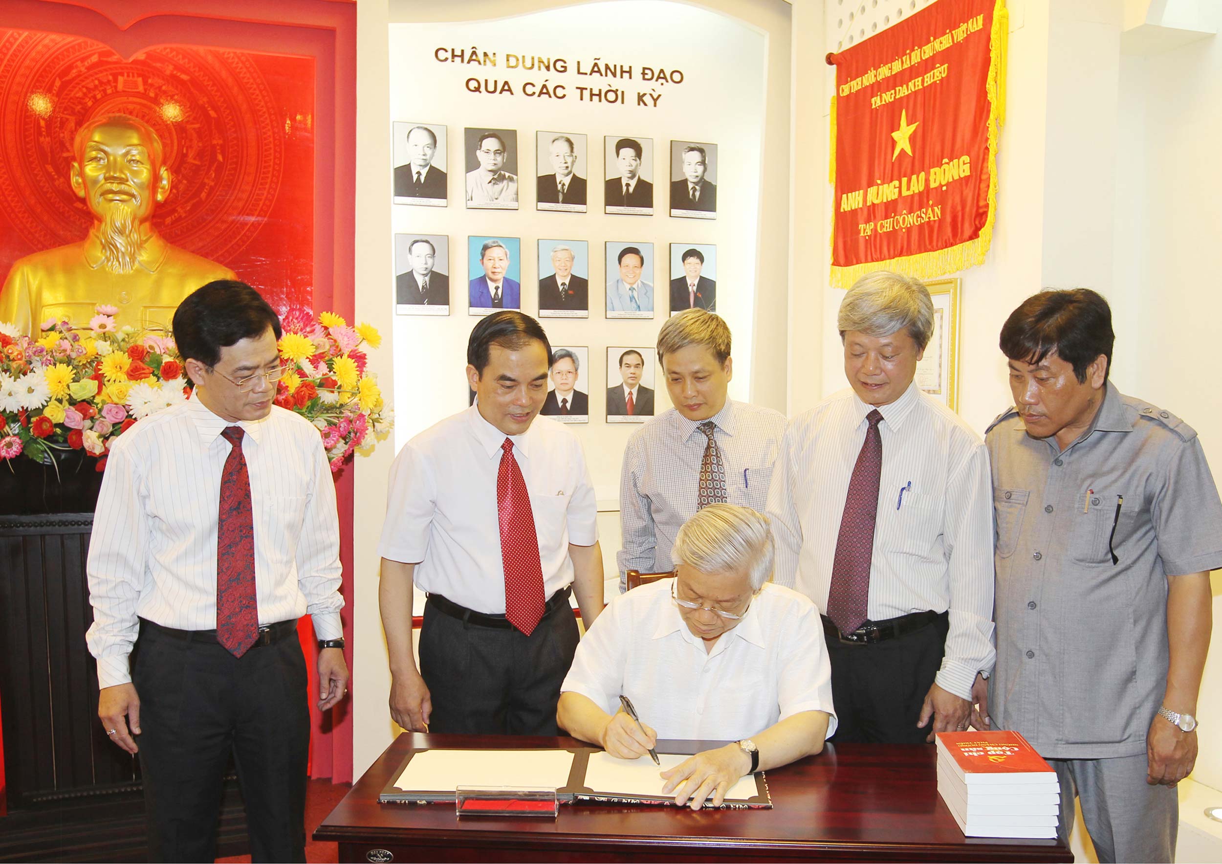 Đồng chí Nguyễn Phú Trọng, Tổng Bí thư Ban Chấp hành Trung ương Đảng Cộng sản Việt Nam, nguyên Tổng Biên tập Tạp chí Cộng sản viết lưu bút tại Phòng truyền thống Tạp chí Cộng sản, ngày 9-6-2012 _Ảnh: Lưu trữ TCCS