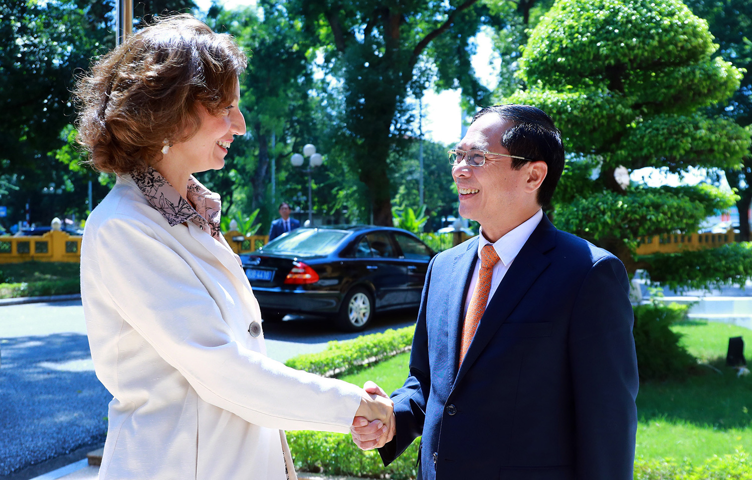 Ủy viên Trung ương Đảng, Bộ trưởng Bộ Ngoại giao Bùi Thanh Sơn đón Tổng Giám đốc UNESCO Audrey Azoulay thăm chính thức Việt Nam _Nguồn: vietnamnet.vn