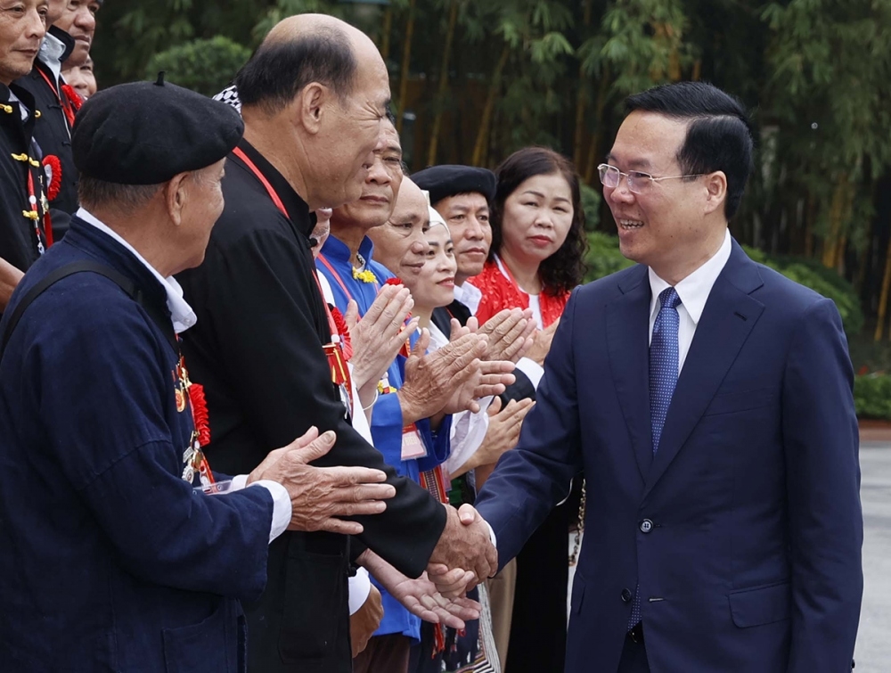 Ủy viên Bộ Chính trị, Chủ tịch nước Võ Văn Thưởng gặp mặt Đoàn đại biểu người có uy tín trong đồng bào dân tộc thiểu số toàn quốc _Ảnh: TTXVN