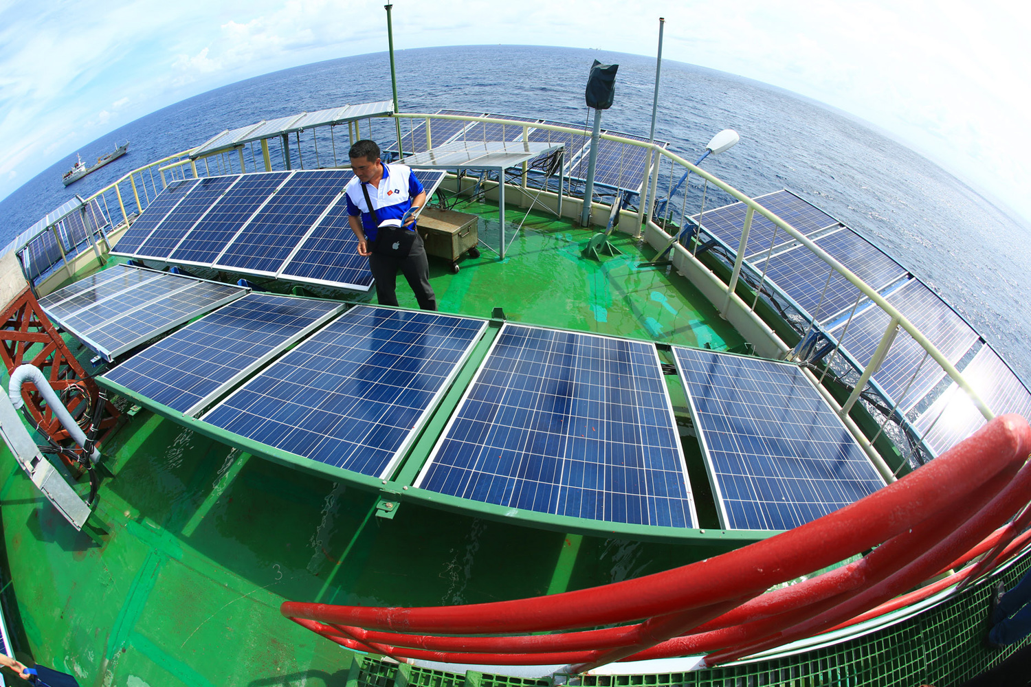 Lắp đặt hệ thống điện mặt trời trên Nhà giàn DK 1 Quế Đường ở thềm lục địa phía Nam của Tổ quốc _Ảnh: TTXVN