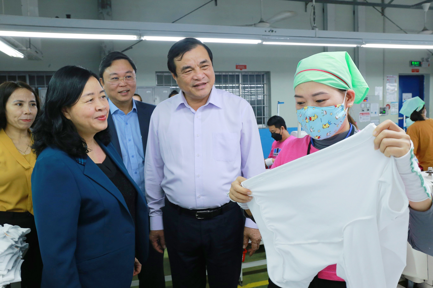 Bí thư Trung ương Đảng, Trưởng Ban Dân vận Trung ương Bùi Thị Minh Hoài thăm hỏi, động viên công nhân Khu công nghiệp Tam Thăng, thành phố Tam Kỳ, tỉnh Quảng Nam _Ảnh: TTXVN