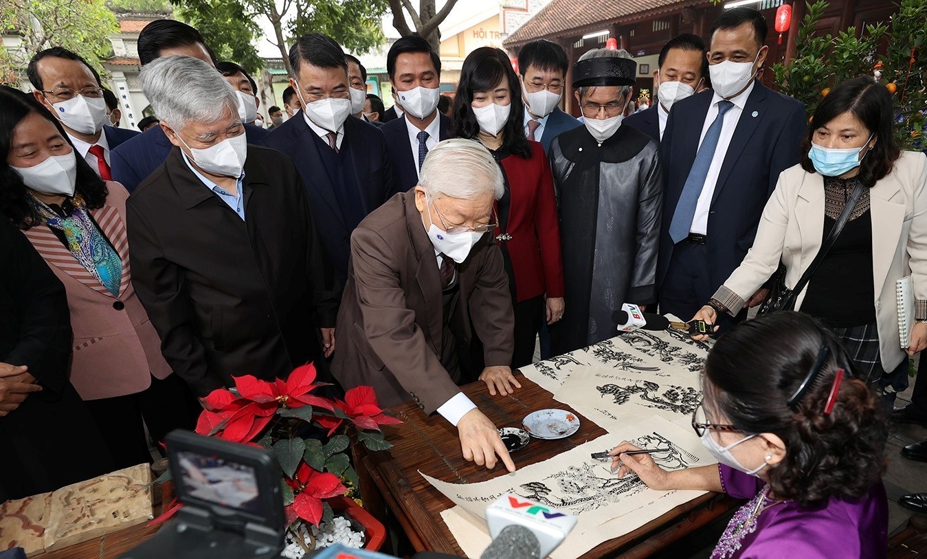 Tổng Bí thư Nguyễn Phú Trọng thăm nơi in tranh dân gian Đông Hồ tại Di tích lịch sử - văn hóa Đền Đô ở khu phố Thượng, phường Đình Bảng, thành phố Từ Sơn, tỉnh Bắc Ninh _Ảnh: TTXVN