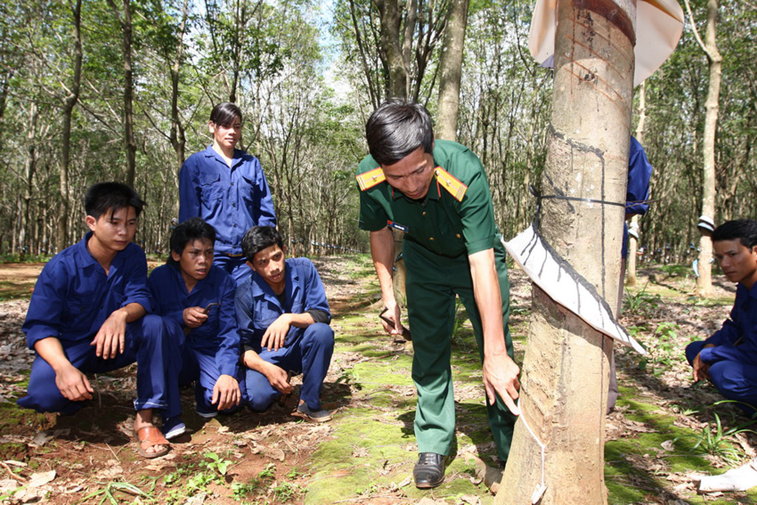 Cán bộ Công ty 75 (Binh đoàn 15) hướng dẫn cách cạo mủ cao su cho công nhân là đồng bào dân tộc Gia-rai ở huyện biên giới Đức Cơ, tỉnh Gia Lai _Ảnh: TTXVN