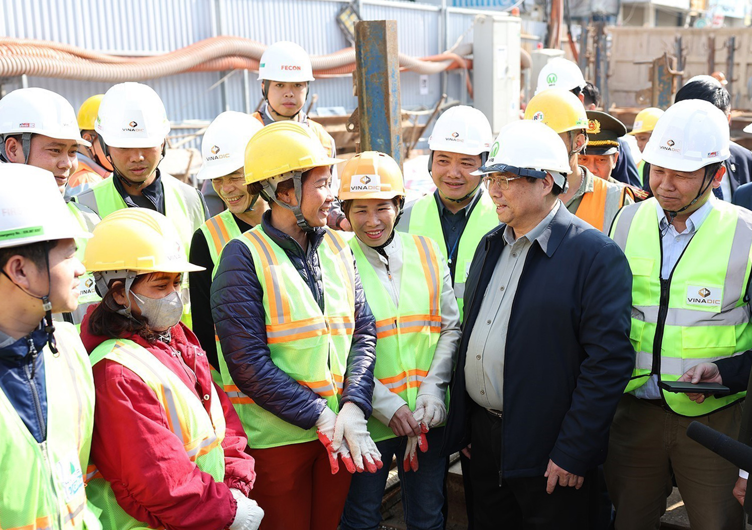 Ủy viên Bộ Chính trị, Thủ tướng Chính phủ Phạm Minh Chính thăm hỏi, chúc tết công nhân đang thi công Dự án đầu tư xây dựng tuyến đường sắt đô thị Nhổn - ga Hà Nội _Ảnh: TTXVN