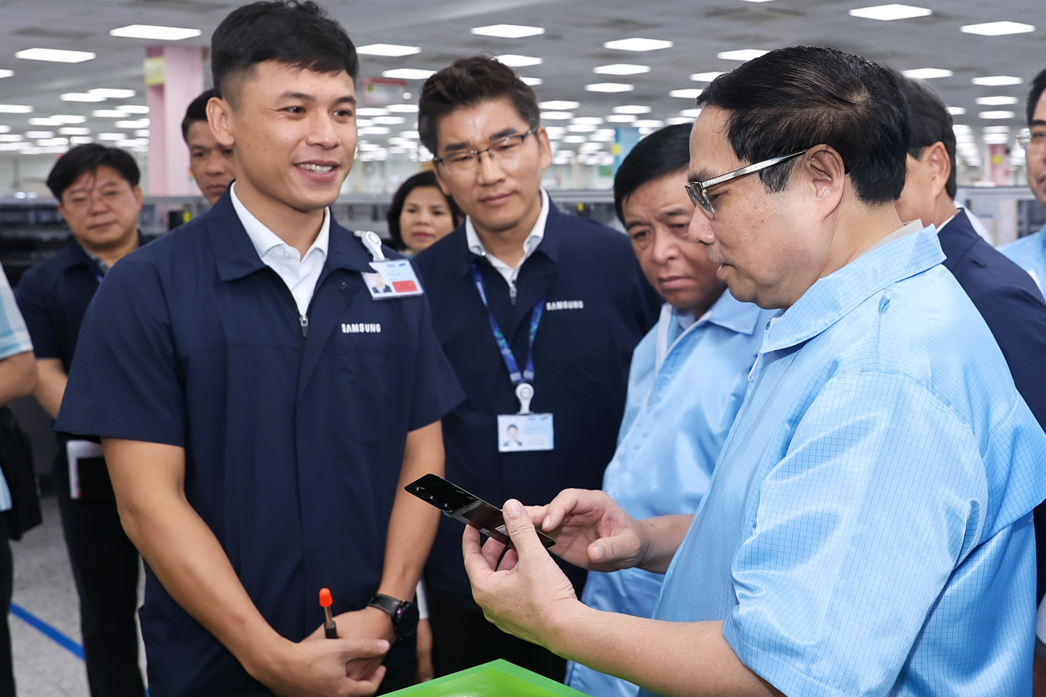 Ủy viên Bộ Chính trị, Thủ tướng Chính phủ Phạm Minh Chính thăm dây chuyền sản xuất thiết bị điện tử của Công ty TNHH Samsung Electronics Việt Nam tại Khu công nghiệp Yên Phong, huyện Yên Phong, tỉnh Bắc Ninh _Ảnh: TTXVN