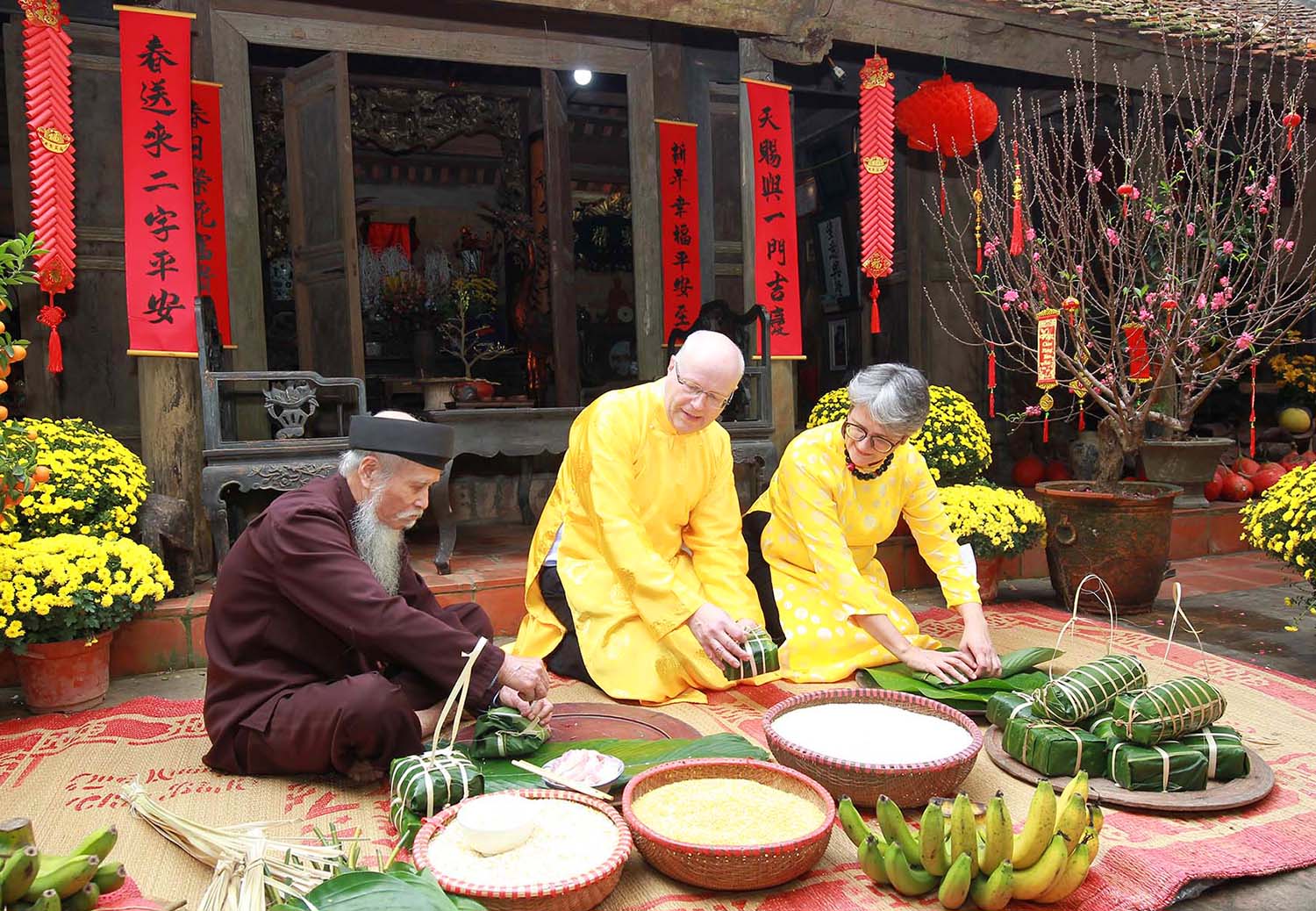 Các đại sứ và đại diện các tổ chức quốc tế tại Việt Nam tìm hiểu về phong tục người Việt Nam trong dịp tết cổ truyền tại làng cổ Đường Lâm, thị xã Sơn Tây, thành phố Hà Nội _Nguồn: baodautu.vn