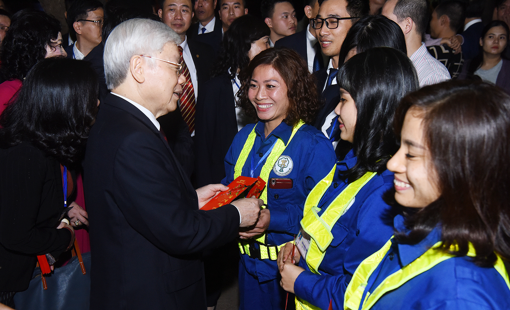 Tổng Bí thư Nguyễn Phú Trọng chúc tết công nhân Công ty cây xanh Hà Nội làm việc trên đường Thanh Niên _Ảnh: Tư liệu