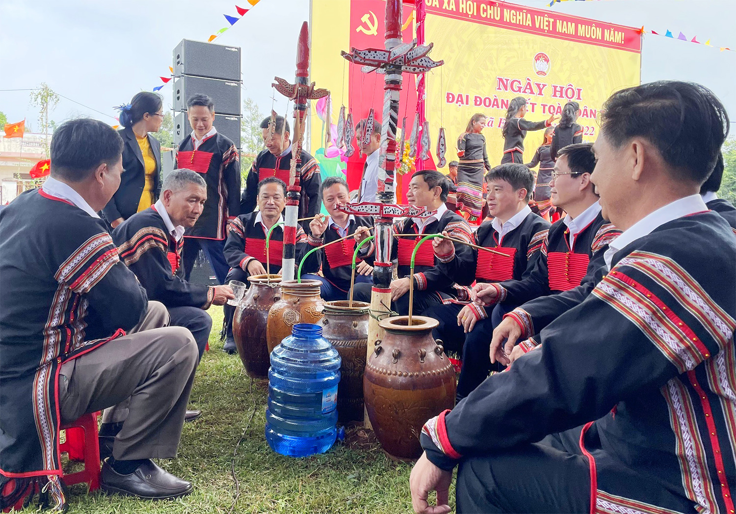 Các đại biểu thưởng thức rượu cần với nhân dân tại Ngày hội đại đoàn kết toàn dân tộc ở buôn Ciết, xã Ea Tiêu, huyện Cư Kuin, tỉnh Đắk Lắk _Ảnh: TTXVN