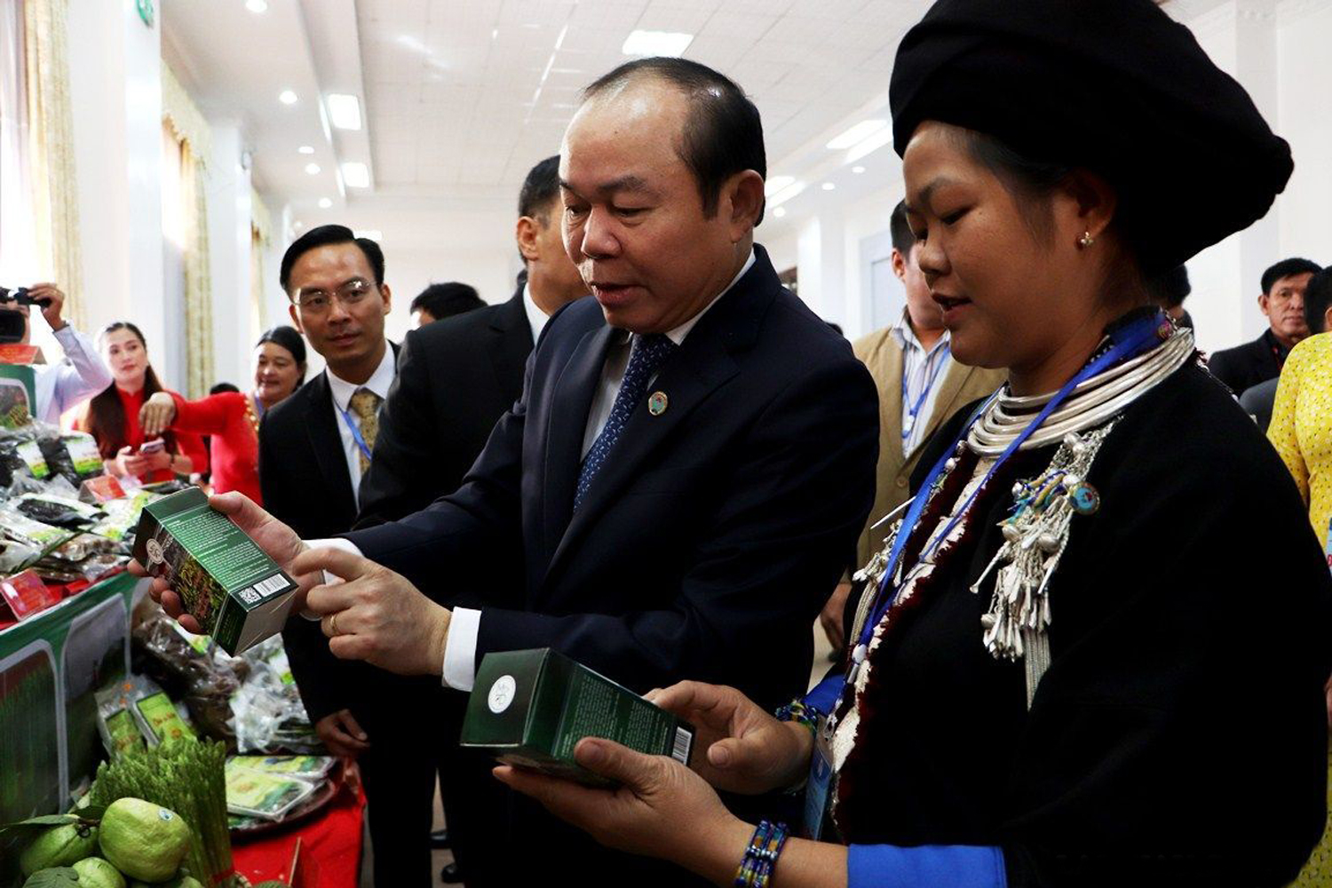 Bí thư Đảng đoàn, Chủ tịch Liên minh Hợp tác xã Việt Nam Nguyễn Ngọc Bảo tham quan gian trưng bày các sản phẩm đặc sản của các thành viên hợp tác xã tại Đại hội Liên minh Hợp tác xã tỉnh Lai Châu lần thứ IV, nhiệm kỳ 2020 - 2025 _Nguồn: laichau.gov.vn