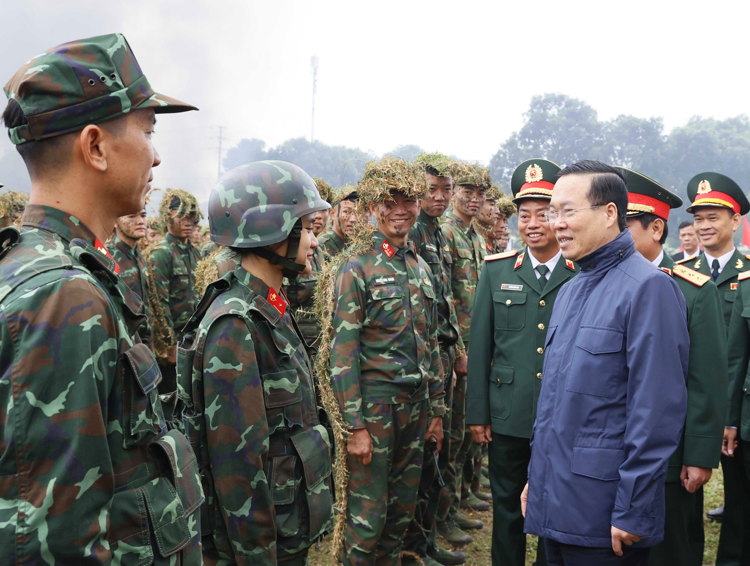 Ủy viên Bộ Chính trị, Chủ tịch nước Võ Văn Thưởng thăm hỏi, động viên bộ đội đặc công tại thao trường huấn luyện _Ảnh: TTXVN