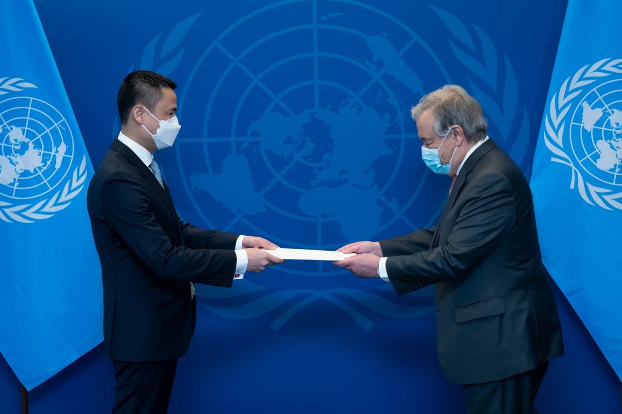 Đại sứ Đặng Hoàng Giang, Trưởng Phái đoàn đại diện thường trực Việt Nam tại Liên hợp quốc trình Thư ủy nhiệm của Ủy viên Bộ Chính trị, Chủ tịch nước Nguyễn Xuân Phúc lên Tổng thư ký Liên hợp quốc António Guterres _Ảnh: TTXVN
