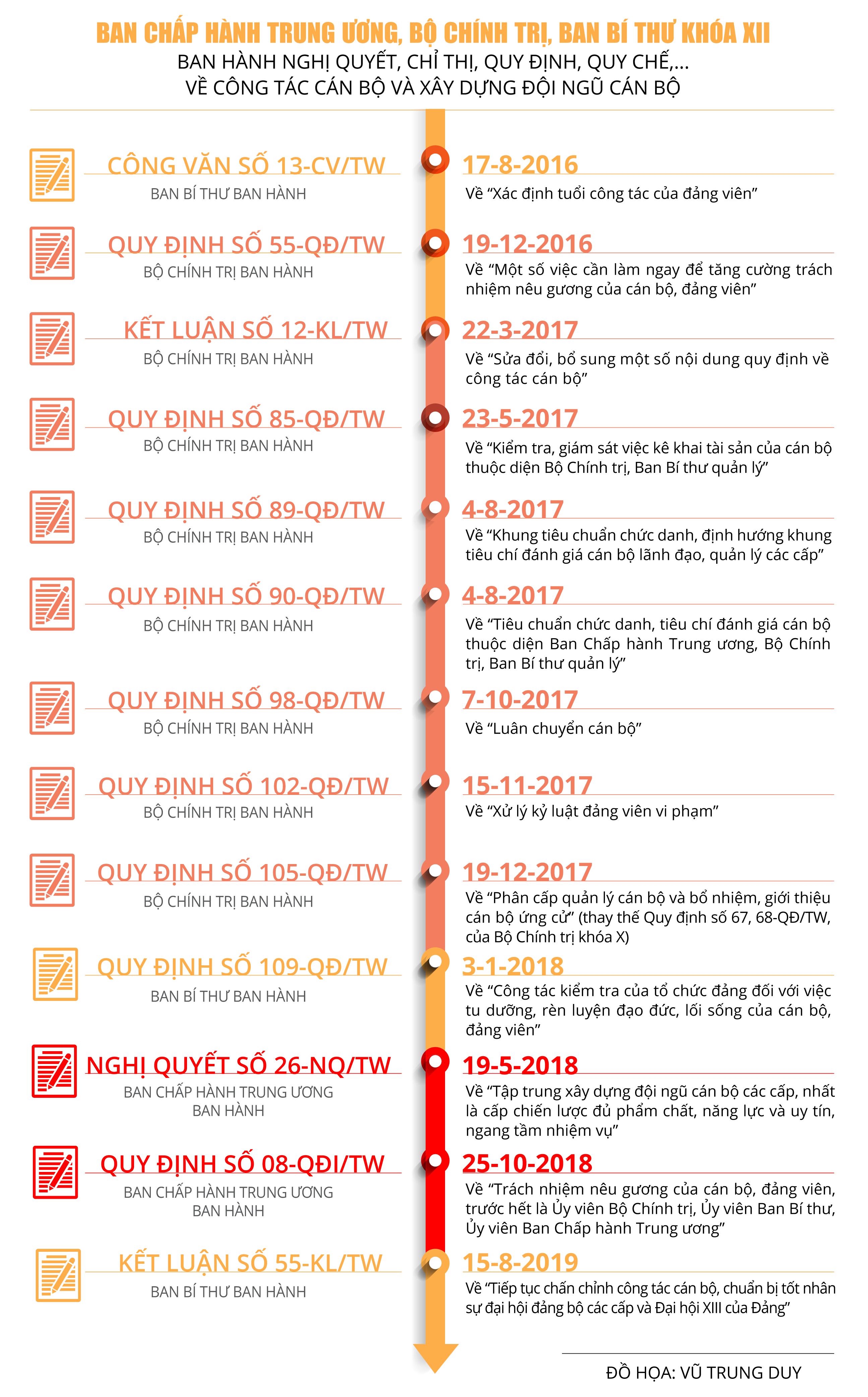 Từ khi thực hiện đường lối đổi mới do Đảng ta khởi xướng và lãnh đạo từ Đại hội VI của Đảng đến nay, Ban Chấp hành Trung ương, Bộ Chính trị, Ban Bí thư các khoá đã ban hành nhiều chủ trương, nghị quyết, chỉ thị, quy định, quy chế,... về công tác cán bộ và xây dựng đội ngũ cán bộ, từng bước hoàn thiện chủ trương, quan điểm của Đảng về công tác cán bộ và xây dựng đội ngũ cán bộ; đặc biệt đến Đại hội XII, Ban Chấp hành Trung ương, Bộ Chính trị, Ban Bí thư đã tập trung lãnh đạo, chỉ đạo việc rà soát, bổ sung, sửa đổi và ban hành nhiều nghị quyết, chỉ thị, quy định, quy chế,... về công tác cán bộ và xây dựng đội ngũ cán bộ để thực hiện. Ban Chấp hành Trung ương ban hành Nghị quyết số 26-NQ/TW, ngày 19-5-2018, về “Tập trung xây dựng đội ngũ cán bộ các cấp, nhất là cấp chiến lược đủ phẩm chất, năng lực và uy tín, ngang tầm nhiệm vụ” và Quy định số 08-QĐi/TW, ngày 25-10-2018, về “Trách nhiệm nêu gương của cán bộ, đảng viên, trước hết là Ủy viên Bộ Chính trị, Ủy viên Ban Bí thư, Ủy viên Ban Chấp hành Trung ương”. Bộ Chính trị ban hành Quy định số 55-QĐ/TW, ngày 19-12-2016, về “Một số việc cần làm ngay để tăng cường trách nhiệm nêu gương của cán bộ, đảng viên”; Kết luận số 12-KL/TW, ngày 22-3-2017, về “Sửa đổi, bổ sung một số nội dung quy định về công tác cán bộ”; Quy định số 85-QĐ/TW, ngày 23-5-2017, về “Kiểm tra, giám sát việc kê khai tài sản của cán bộ thuộc diện Bộ Chính trị, Ban Bí thư quản lý”; Quy định số 89-QĐ/TW, ngày 4-8-2017, về “Khung tiêu chuẩn chức danh, định hướng khung tiêu chí đánh giá cán bộ lãnh đạo, quản lý các cấp” và Quy định số 90-QĐ/TW, ngày 4-8-2017, về “Tiêu chuẩn chức danh, tiêu chí đánh giá cán bộ thuộc diện Ban Chấp hành Trung ương, Bộ Chính trị, Ban Bí thư quản lý”, làm cơ sở để các cấp ủy, tổ chức đảng cụ thể hóa tiêu chí đánh giá đối với cán bộ; Quy định số 98-QĐ/TW, ngày 7-10-2017, về “Luân chuyển cán bộ”; Quy định số 102-QĐ/TW, ngày 15-11-2017, về “Xử lý kỷ luật đảng viên vi phạm”, quy định cụ thể về thời hiệu xử lý kỷ luật đối với đảng viên vi phạm, khắc phục tư tưởng “tư duy nhiệm kỳ” trong đội ngũ cán bộ, đảng viên và quan niệm khi đã nghỉ hưu hoặc chuyển công tác khác là “hạ cánh an toàn”; Quy định số105-QĐ/TW, ngày 19-12-2017, về “Phân cấp quản lý cán bộ và bổ nhiệm, giới thiệu cán bộ ứng cử” để thay thế Quy định số 67, 68-QĐ/TW, của Bộ Chính trị khóa X, với tinh thần đổi mới là đẩy mạnh việc phân cấp quản lý cán bộ và bổ sung, hoàn thiện quy trình 5 bước khi tiến hành bổ nhiệm và giới thiệu cán bộ ứng cử, bảo đảm dân chủ, khách quan, công khai, minh bạch, chặt chẽ hơn.