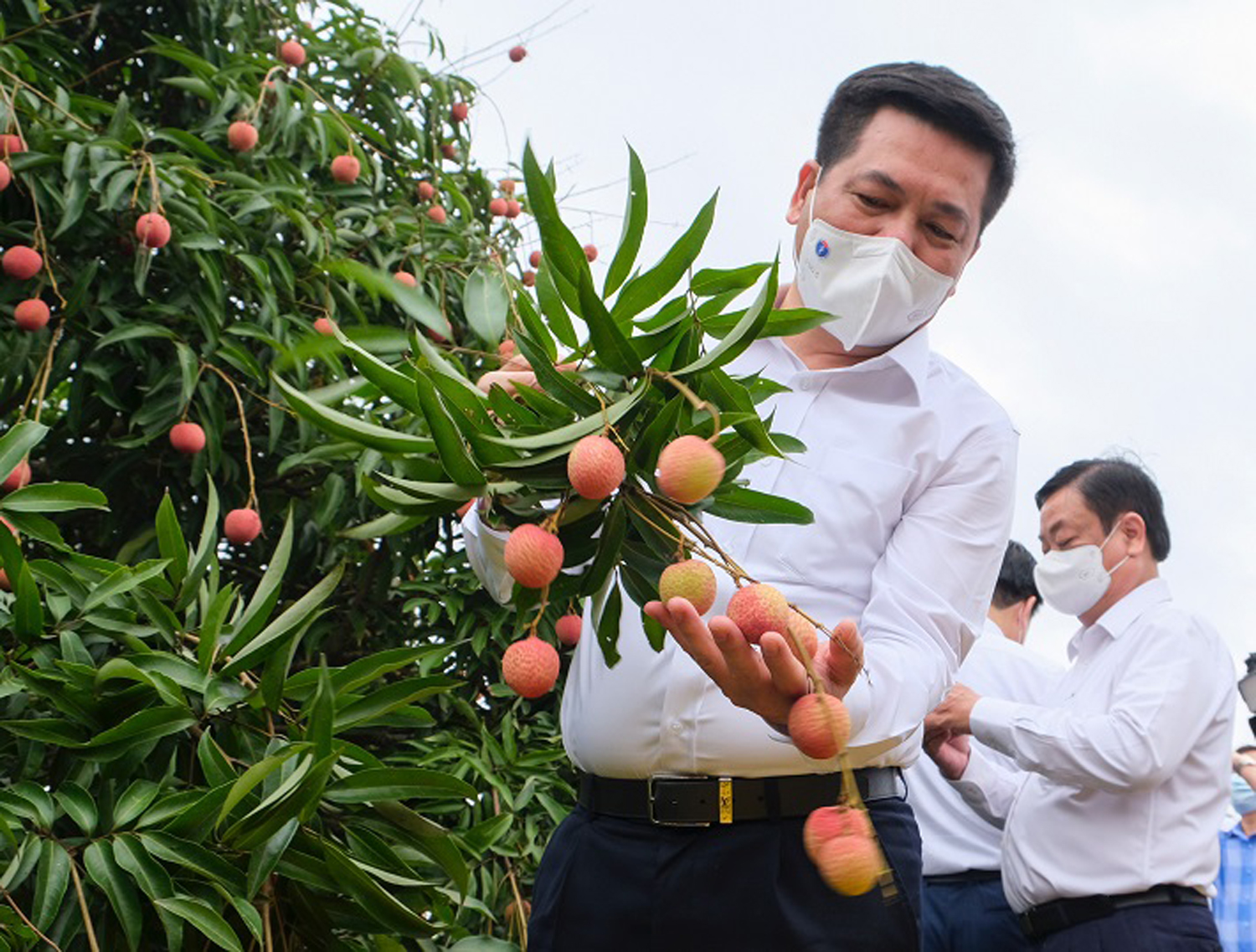 Ủy viên Trung ương Đảng, Bộ trưởng Bộ Công Thương Nguyễn Hồng Diên và các đại biểu tham quan vườn vải thiều xuất khẩu tại xã Thanh Quang, huyện Thanh Hà, tỉnh Hải Dương _Nguồn: tapchicongthuong.vn